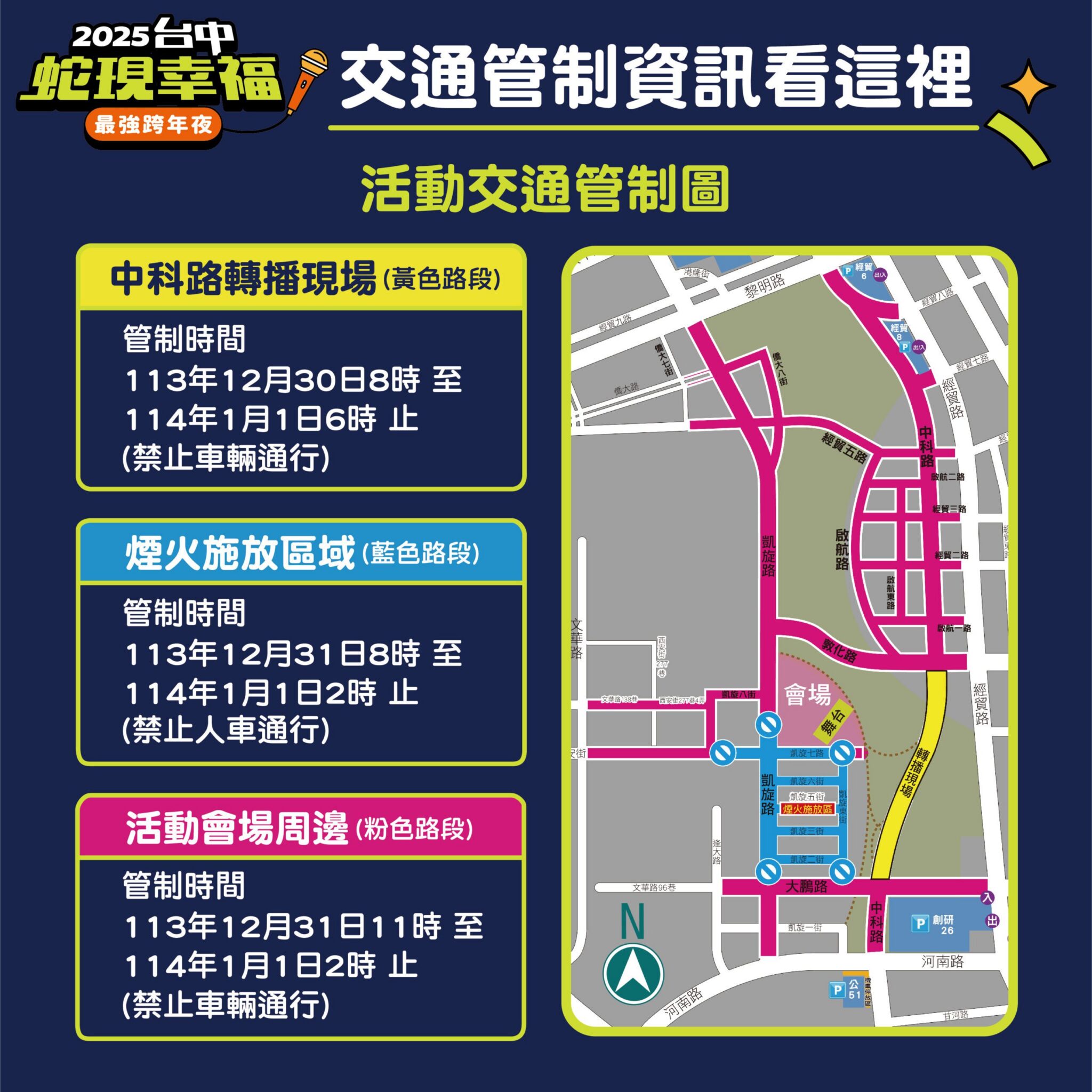 另有關活動交通資訊,市府將在甘肅路規劃人行專用通道,鼓勵民眾可透過捷運加步行方式前往會場,市府也提供市府線、松竹線、水湳線3條免費接駁路線,以短程接駁疏運為策略,串聯重要交通轉運節點,提供高鐵、台鐵及停車場轉乘服務。接駁車配合活動時間,前往會場的班次為下午5時30分至晚間11時;由會場往接駁站則為晚間10時至隔日凌晨1時30分,班次約10至15分鐘一班,坐滿或時間到就發車,讓民眾不必候車過久。