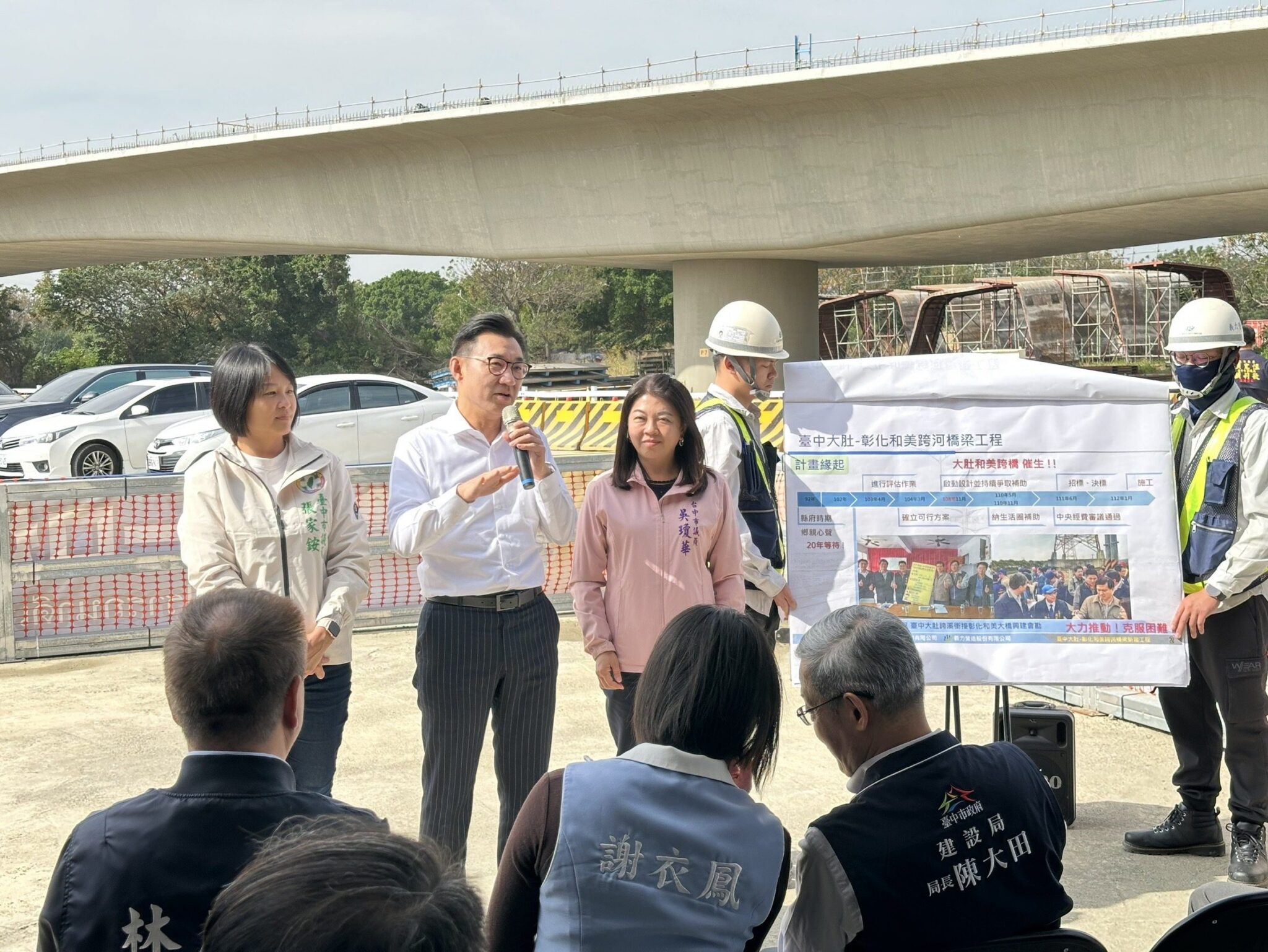 陳局長進一步說明,這座橋梁是鄉親們多年的期盼,經過地方與中央政府的攜手努力,結合交通部與內政部的支持,終於在111年動工。設計結合烏溪周邊景觀,採用象形梁橋與光滑混凝土建築,展現出結構的美感與實用性,未來大橋不僅能將原本需繞行超過30分鐘的路程縮短至2至3分鐘,還有望成為大肚溪日落觀景的熱門景點。