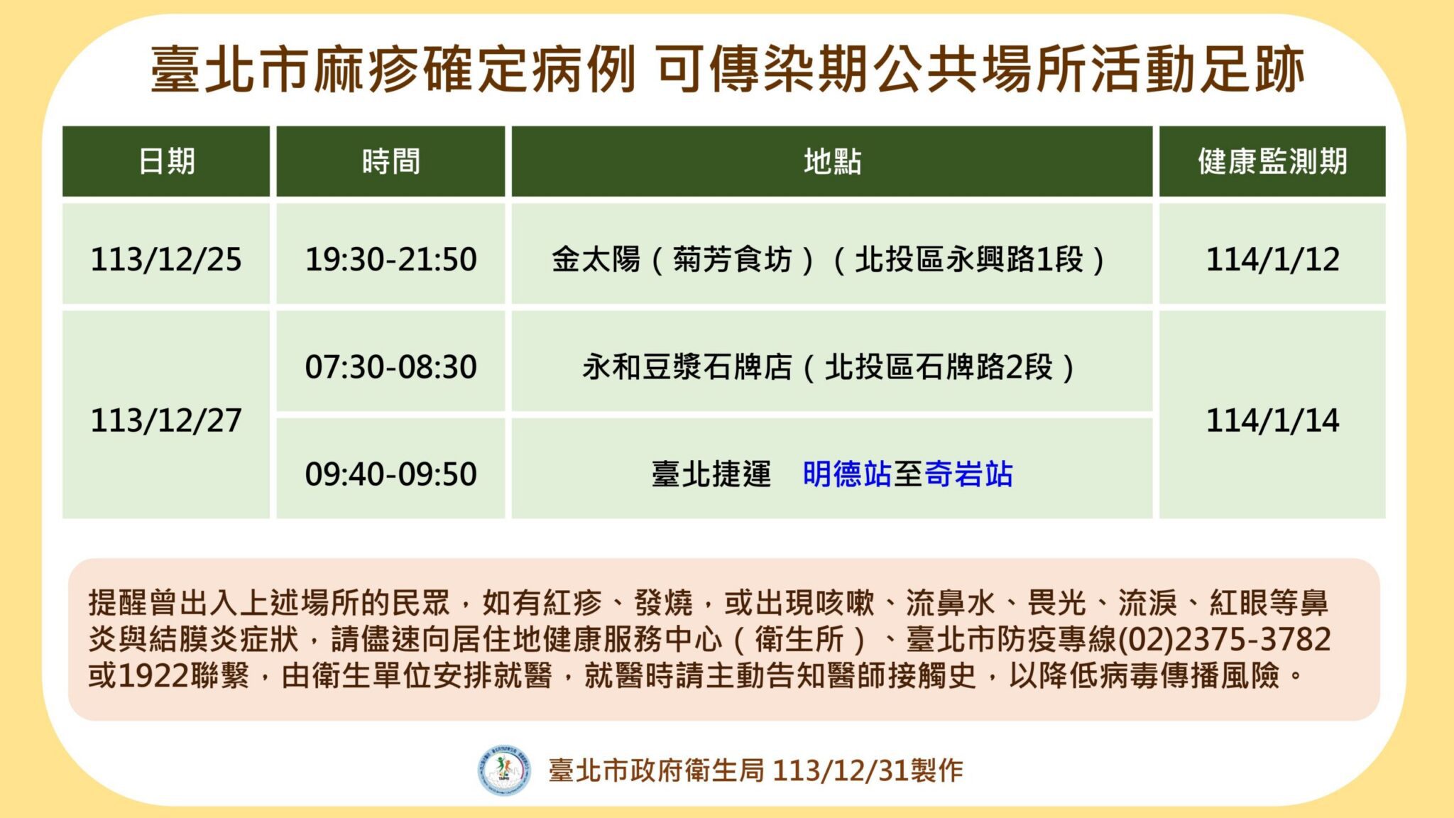 北市衛生局公布麻疹確定病例於可傳染期間25日及27日活動足跡,於25日晚上至北投金太陽小吃店活動及27日上午於北投區石牌路2段永和豆漿用餐,並搭乘臺北捷運紅線自明德站至奇岩站,衛生局提醒曾於相關場所出入的民眾,請進行自主健康管理至1月14日。