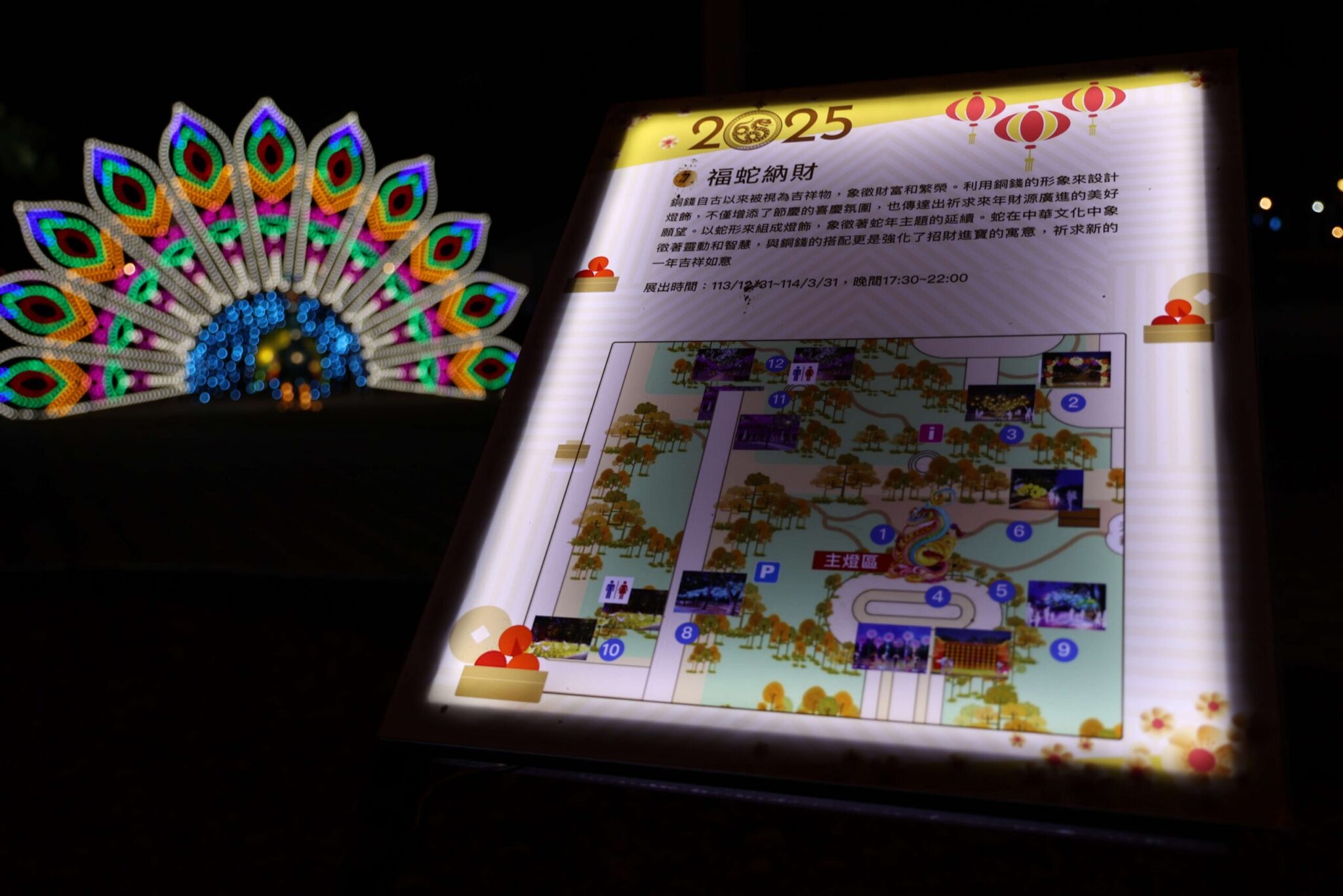 斗六蛇年燈會於膨鼠森林公園內打造了13座燈區,主燈以舞動的錦蛇為型態,結合金色象徵吉祥的意涵,代表金蛇迎新春,五福臨斗六的好兆頭。斗六市長林聖爵指出,有別於各地跨年晚會,斗六有蛇年燈會啟燈,民眾觀看表演也可以欣賞燈會,除有傳統花燈,還有結合地景的自然森林、草皮及光環境的營造。