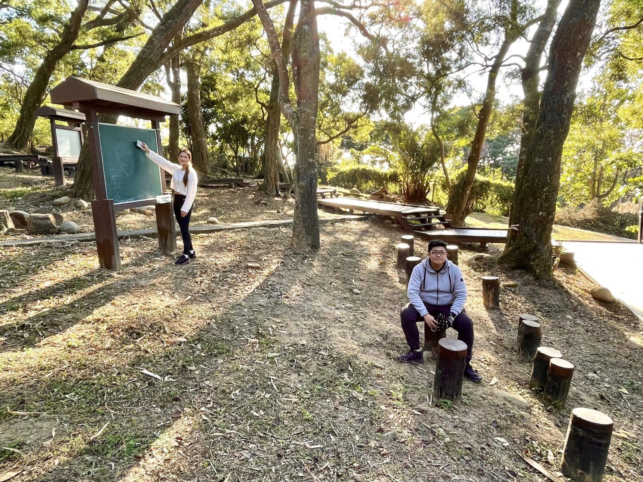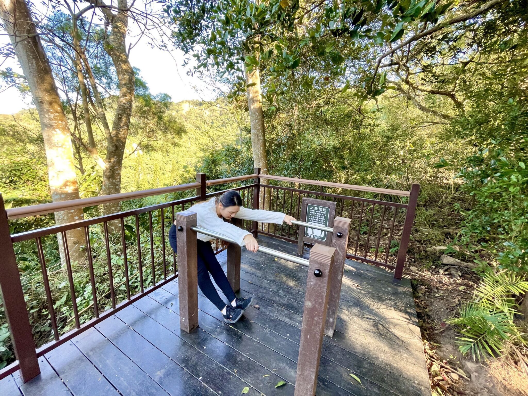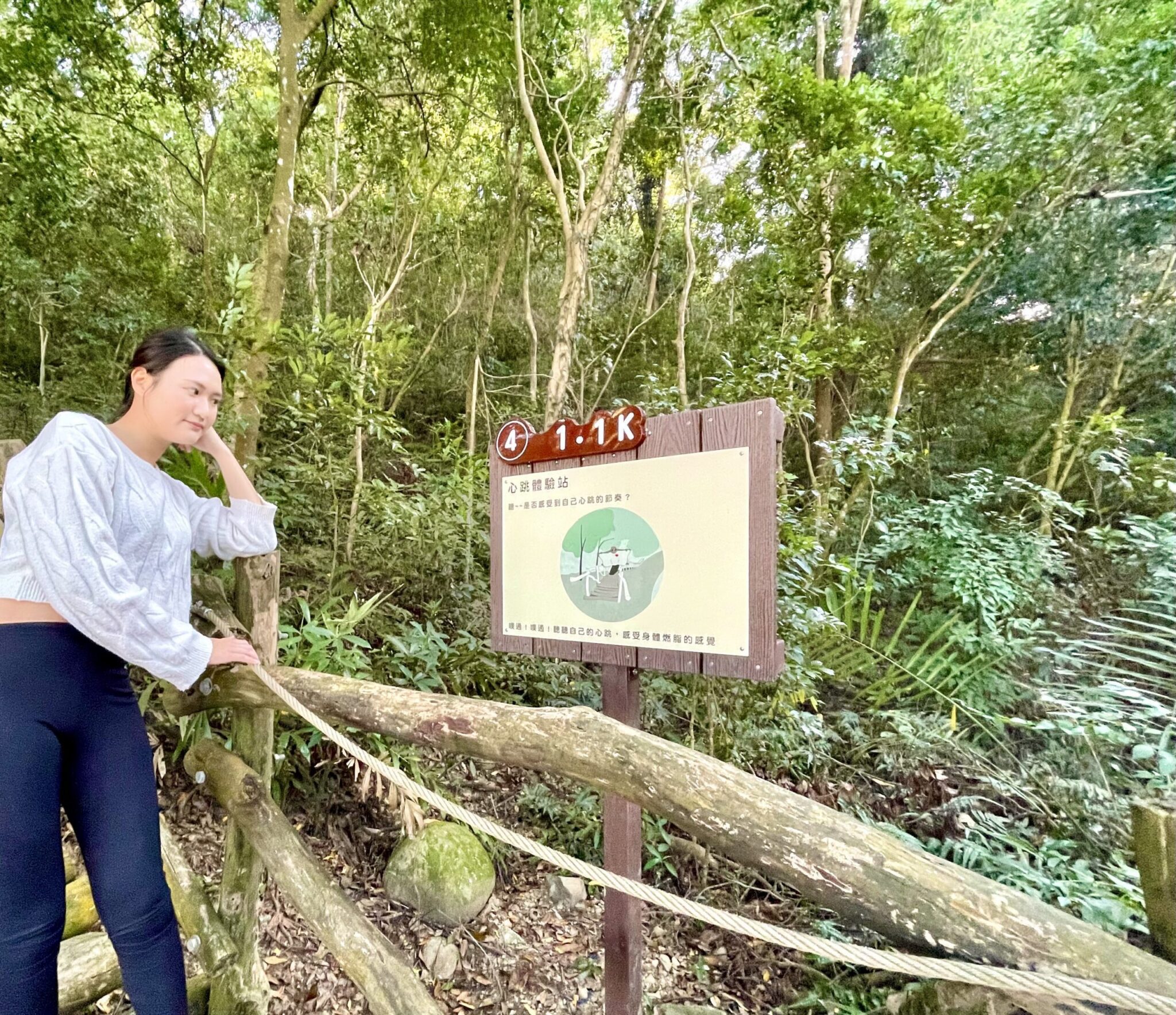接著,沿著林間小徑走在相思林間,來到0.6K心情放空站,這裡除了涼亭可以休息,還有拉筋設施可以舒緩一下緊繃的肌肉;舒緩後上行來到0.9K心情調適站,此時已完成一半路程,心情十分愉悅,另一種形式的拉筋板,剛好舒緩微酸的小腿後再出發,會經過一段大魔王級上下坡,來到1.1K心跳體驗站,再經過一段上下坡,感受穿梭充滿蕨類植物的茂密山林,來到1.4K幽谷環境站,這環境優美,可以眺望山林美景,再往前來到1.5K乳酸集結站,會有種全身熱氣爆發的感覺,最後走到終點-逍遙自在站,在逍遙亭遠眺群山環抱的美景,十分放鬆舒坦,1號健身步道不容小覷,揮汗淋漓,實測來回一趟燃燒卡路里達700大卡。