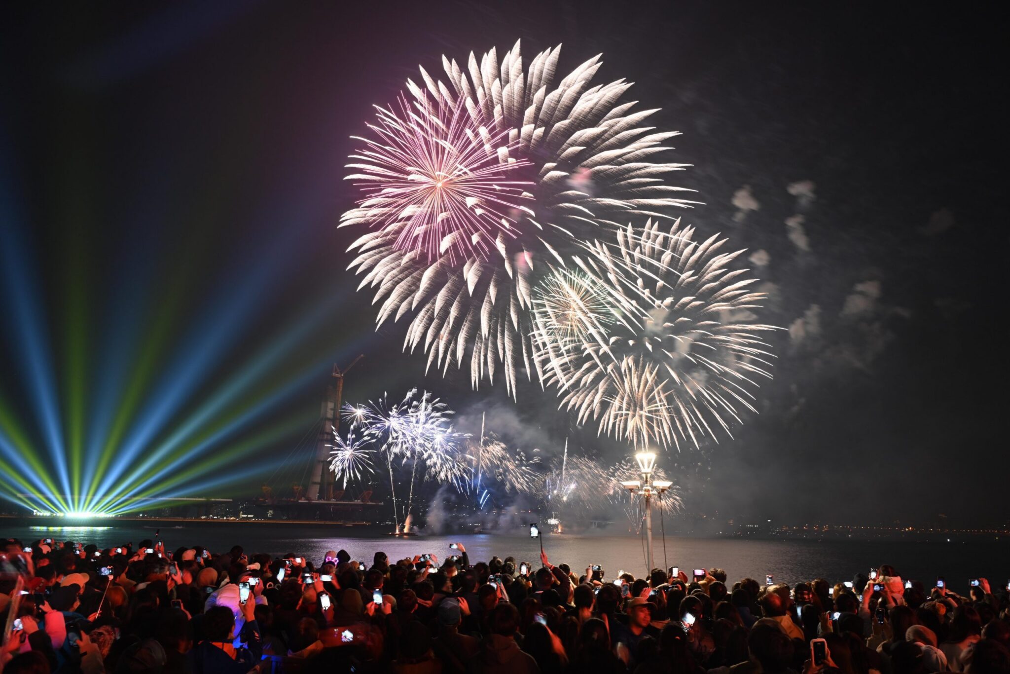 新北年度盛事「閃耀新北1314跨河煙火」昨(12/31)日在淡水漁人碼頭、海關碼頭以及八里左岸公園絢爛登場,市長侯友宜率市府團隊在淡水漁人碼頭主會場與市民一同欣賞煙火秀。侯友宜表示,本次煙火於20時25分演出,延續前兩年施放13分14秒,結合全長920公尺的淡江大橋,象徵「一生一世就愛你」寓意,盼以璀璨煙火迎向2025,也期待明年雙北世壯運及淡江大橋落成「雙喜」順利圓滿。