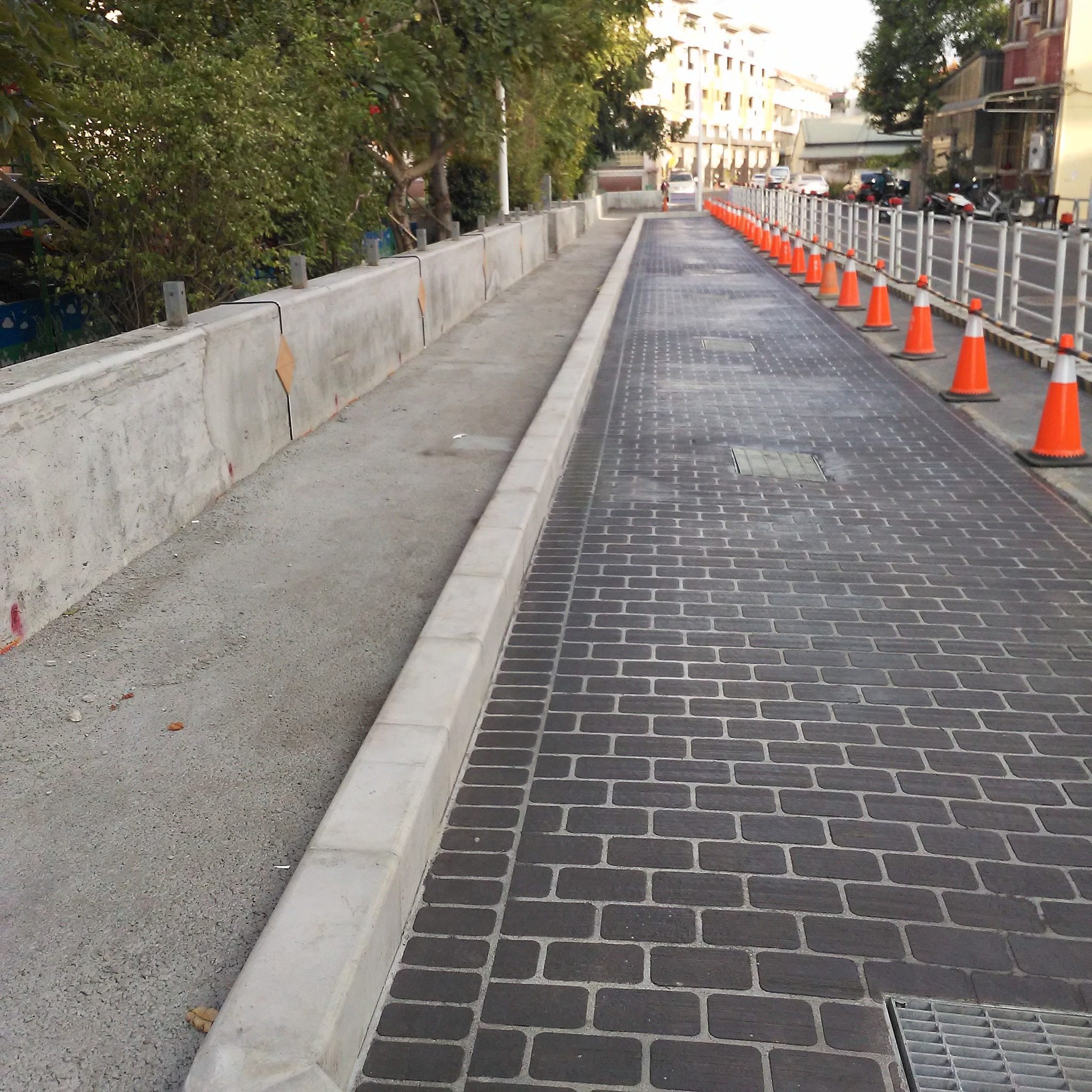 嘉義市北園國小及北園國中原本並無通學步道,市府經與校方協調後學校同意將既有圍牆退縮,提供空間作為步道使用,工程施工範圍由西向東依序北園街、北社尾路、北社尾166巷及雙園街全長約550公尺,新設步道寬度為1.5公尺~3公尺,工程改善內容包含新設家長接送區、並與台電公司共同合作推動纜線下地工程重現天際線,同時整合交通處進行路口外推、縮短行穿線及調整車道寬度配置、新設步道採透水磚與透水鋪面 能提升城市防洪韌性,校園周邊植栽綠美化來達成淨零永續指標。