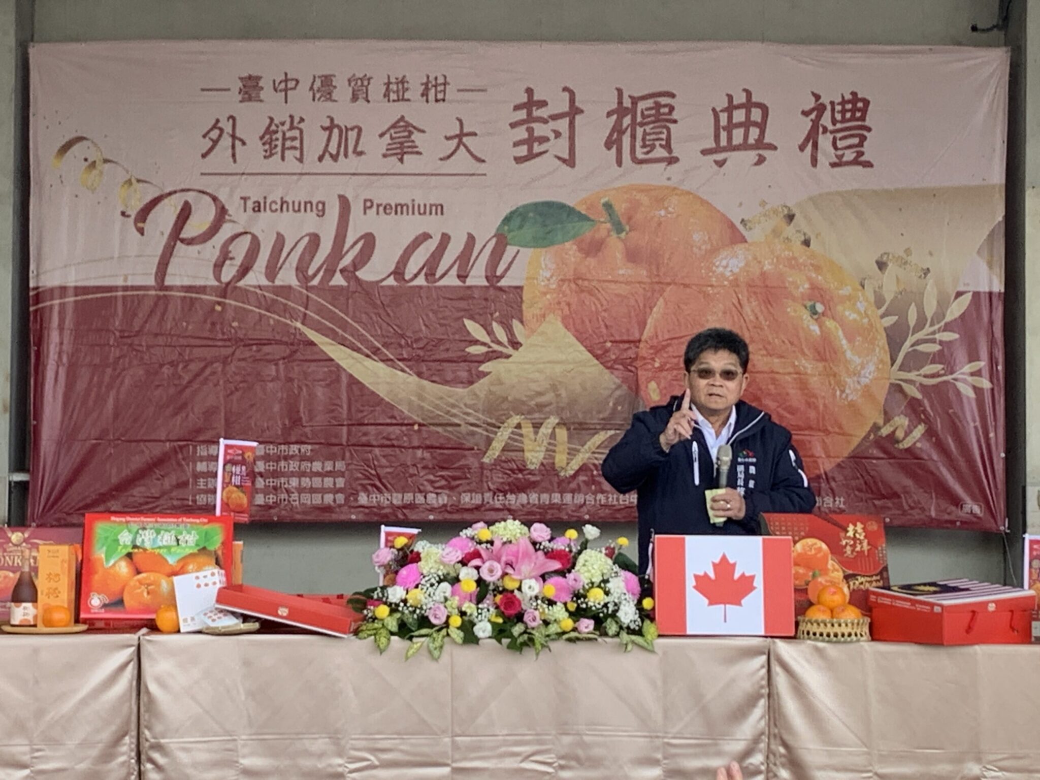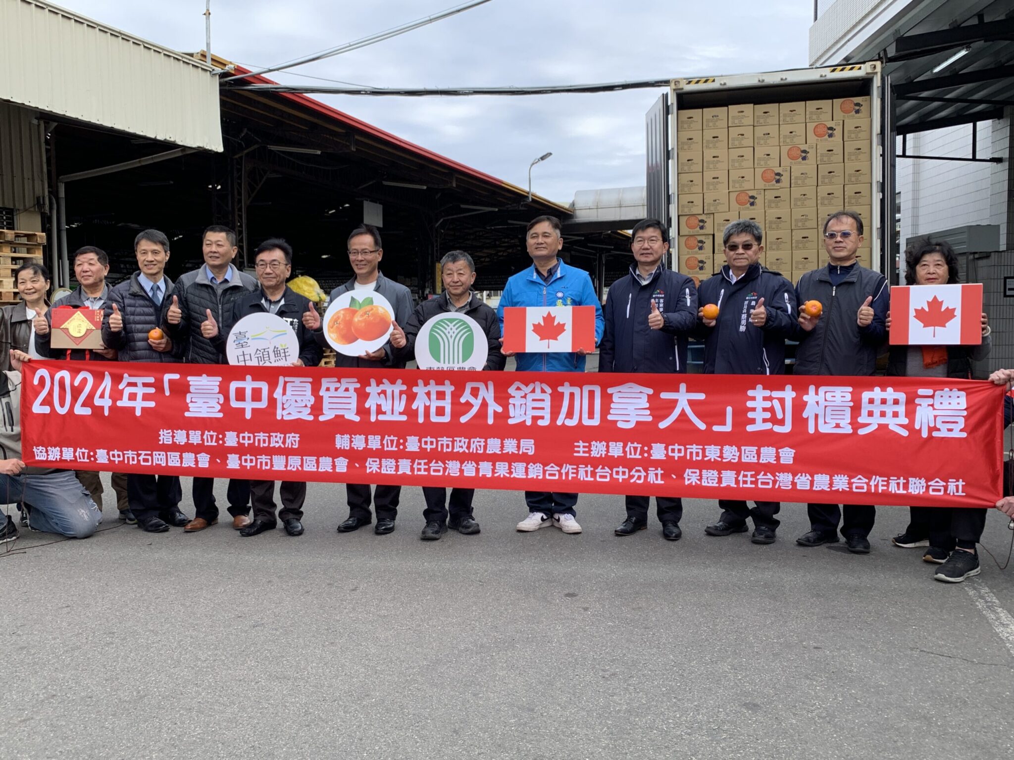 台中市政府農業局持續輔導農民團體外銷農特產品,今(3)日於東勢果菜市場舉辦「台中優質椪柑外銷加拿大封櫃典禮」,今年外銷北美市場的椪柑突破82公噸,較去年略成長,協助農民開拓新市場,有效穩定國內價格及提升農民收益。