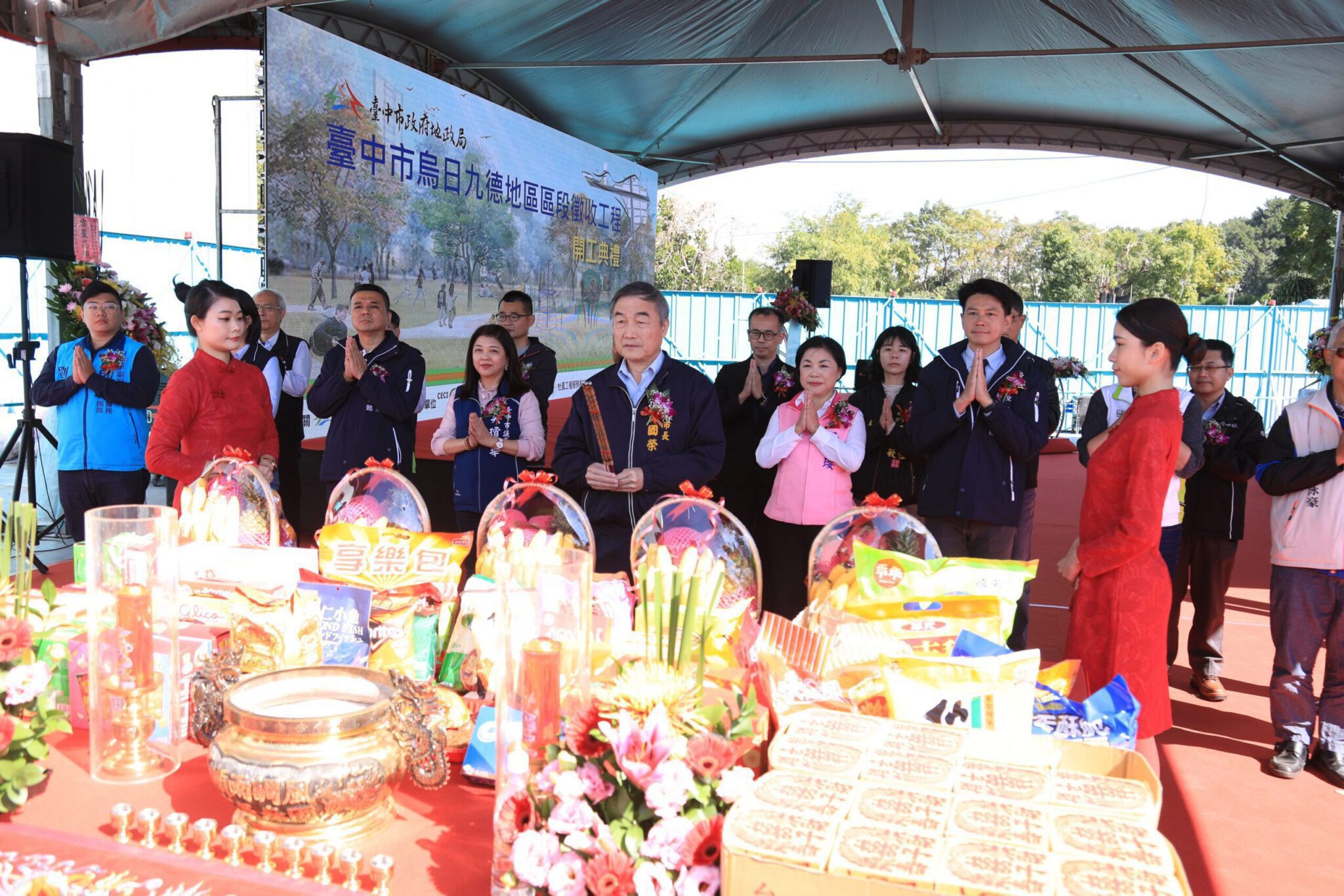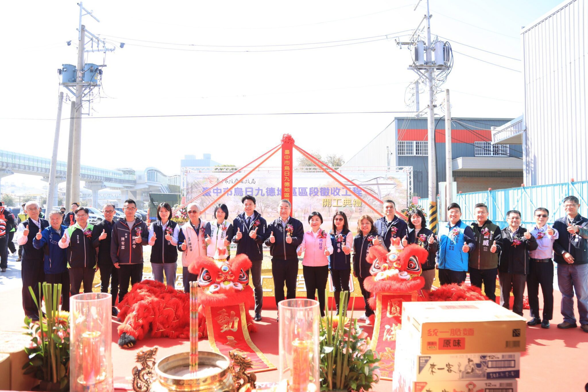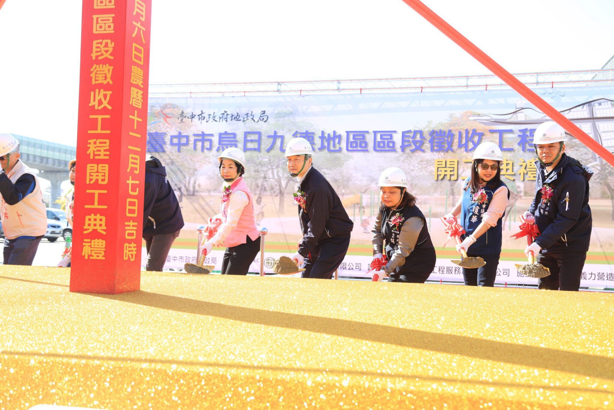 台中市政府地政局今(6)日舉辦烏日九德地區區段徵收工程開工典禮,副市長黃國榮代表市長盧秀燕出席並表示,該區段是台中唯一擁有高鐵、台鐵、捷運「三鐵共構」的行政區,前景看好,特別感謝地政局團隊的努力,台中市在推動市區段徵收重劃的規模全台領先、成果卓越。黃副市長與眾多立委、議員、里長及地方仕紳等貴賓共同祭拜祈福,祈求開工順利平安。