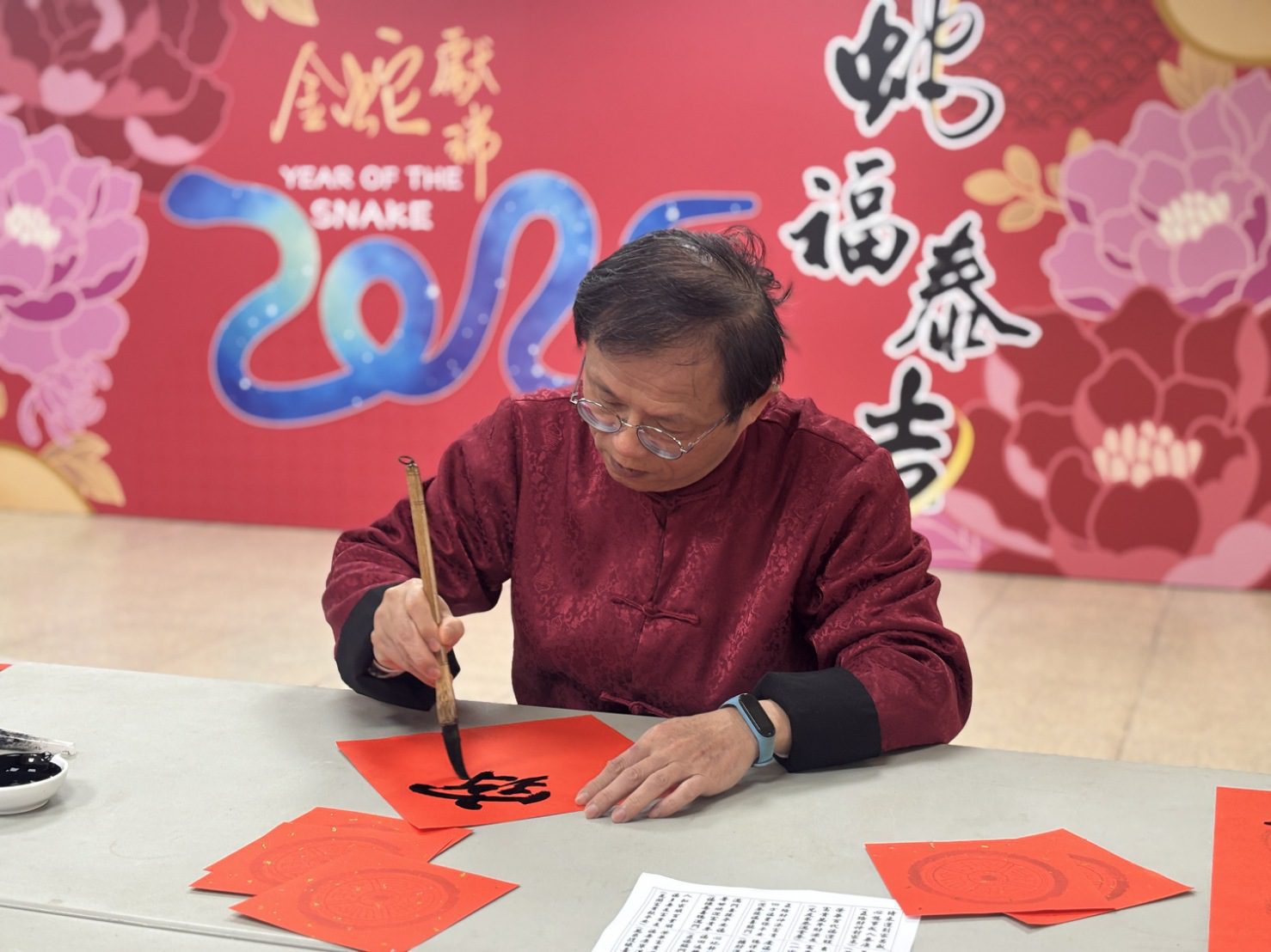 新北市林口區公所連續第八年舉辦的「新春揮毫贈春聯活動」首場今(9日)日在區公所開跑,活動將延續至1月18日共計六場,邀請多位書法名家現場揮毫,讓居民就近欣賞書法藝術之美,同時也能免費索取大師親筆書寫的春聯,為新年增添喜氣與祝福。今年活動更特別加入創意彩墨元素,融合傳統與現代,讓每一幅春聯都別具巧思。另外今年新北市政府推出的蛇年春聯「蛇福泰吉」,即日起亦可至區公所1樓免費索取。蛇福泰吉的台語諧音是「全(都)好,賺錢」,祝福大家蛇年萬事都好,都賺錢。