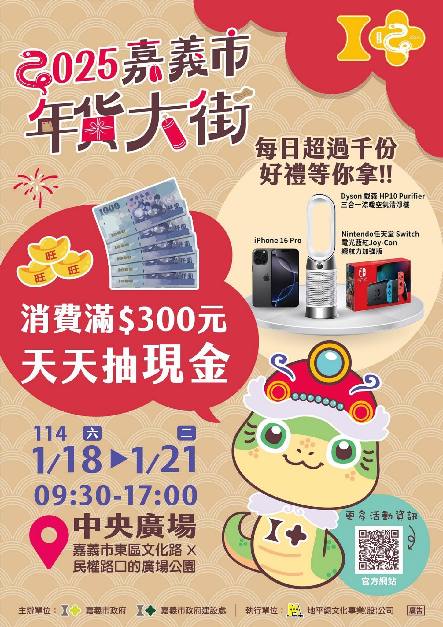 年節將近,萬眾期盼的2025嘉義市年貨大街又來了!延續2024年銷售佳績,嘉義市政府舉辦2025嘉義市年貨大街,即將在年前的1/18(六) 至1/21(二),每天早上9點半到下午5點於嘉義市文化路中央廣場熱鬧登場。活動期間免費領取限量蛇年燈籠、書法老師提字春聯與打卡牆好禮,消費滿300元天天抽萬元現金,每日超過千項禮品拿不完,最低至少3%回饋折價金。不僅如此,現場舞台除了精彩表演外,亦有有獎徵答、一元競標與限時促銷活動,讓民眾有機會以最優惠的價錢把年貨好禮帶回家,歡迎市民相揪親朋好友一起「來嘉過年」。