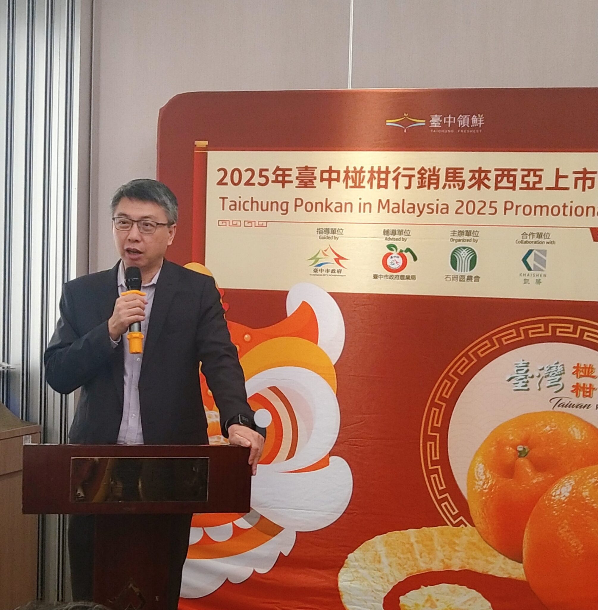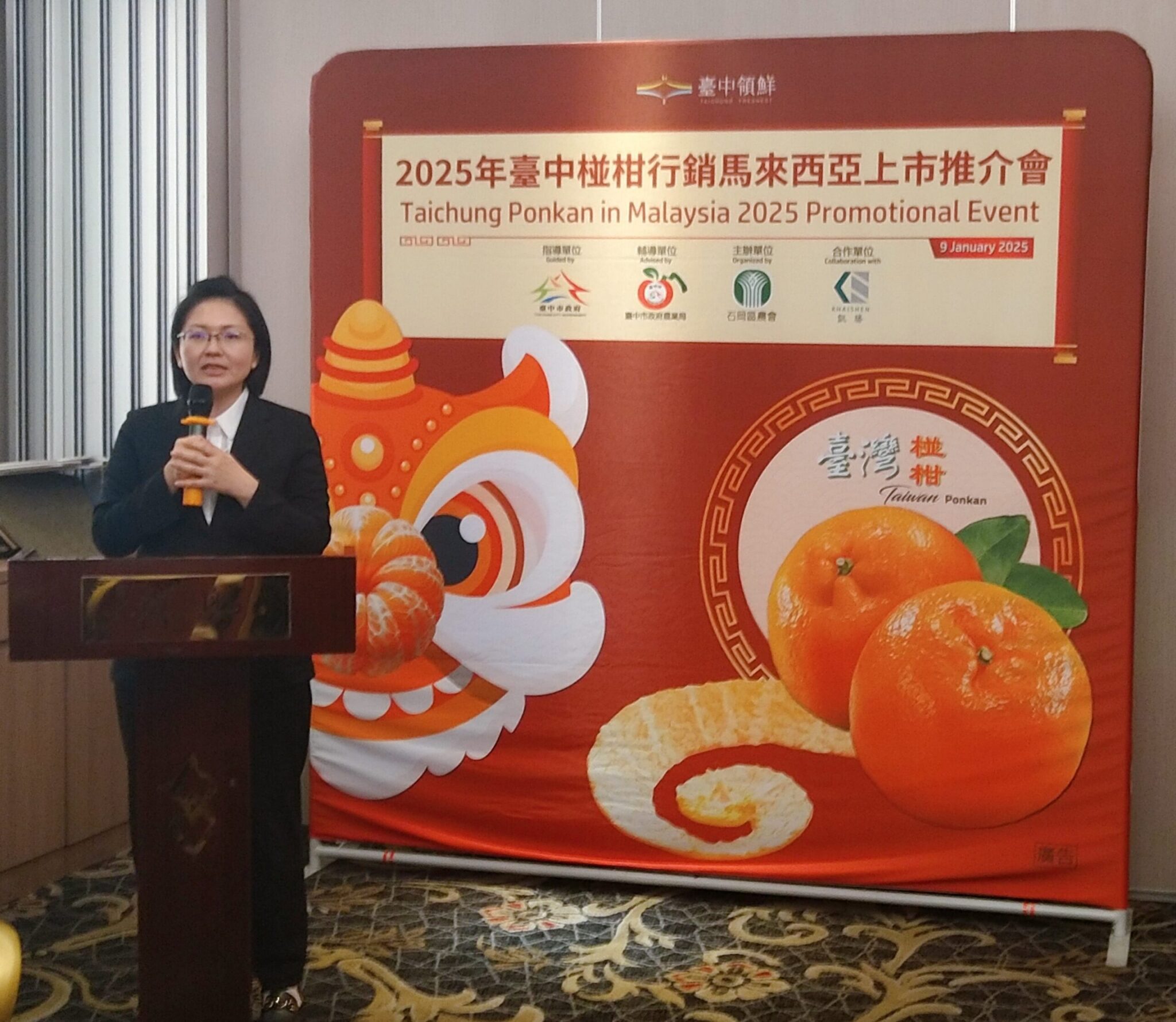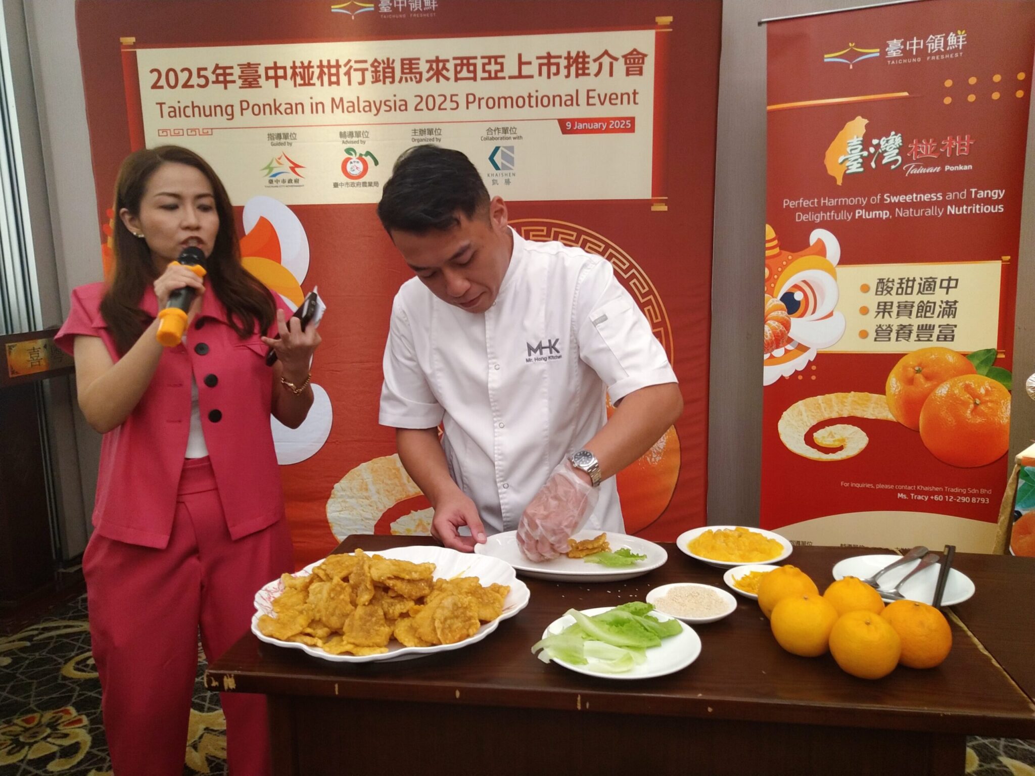 台中市政府長年推動台中市優質椪柑至國外通路,今年冬季首波外銷1貨櫃計15公噸椪柑至馬來西亞,今(9)日派員至馬來西亞Grand Imperial Restaurant舉辦「2025台中椪柑行銷馬來西亞上市推介會」,將甘甜多汁的椪柑推介給當地民眾,並透過RT Pastry雅特烘焙將椪柑與糕點結合,合作販售Mandarin Orange Bun(椪柑麵包)限量商品,及與網紅合作推出椪柑如意雞料理,提供消費者豐富的味覺饗宴,期透過此次行銷活動鏈結雙方經貿交流。
