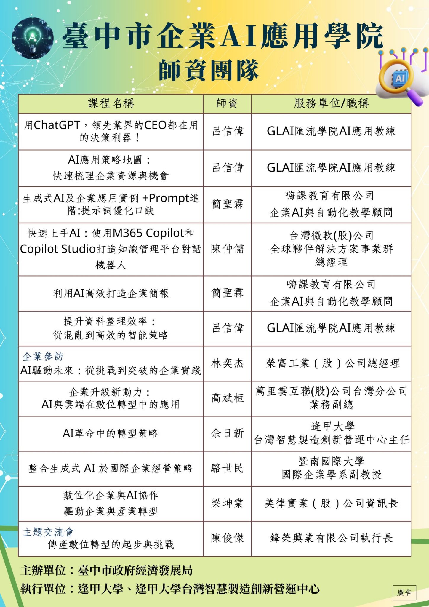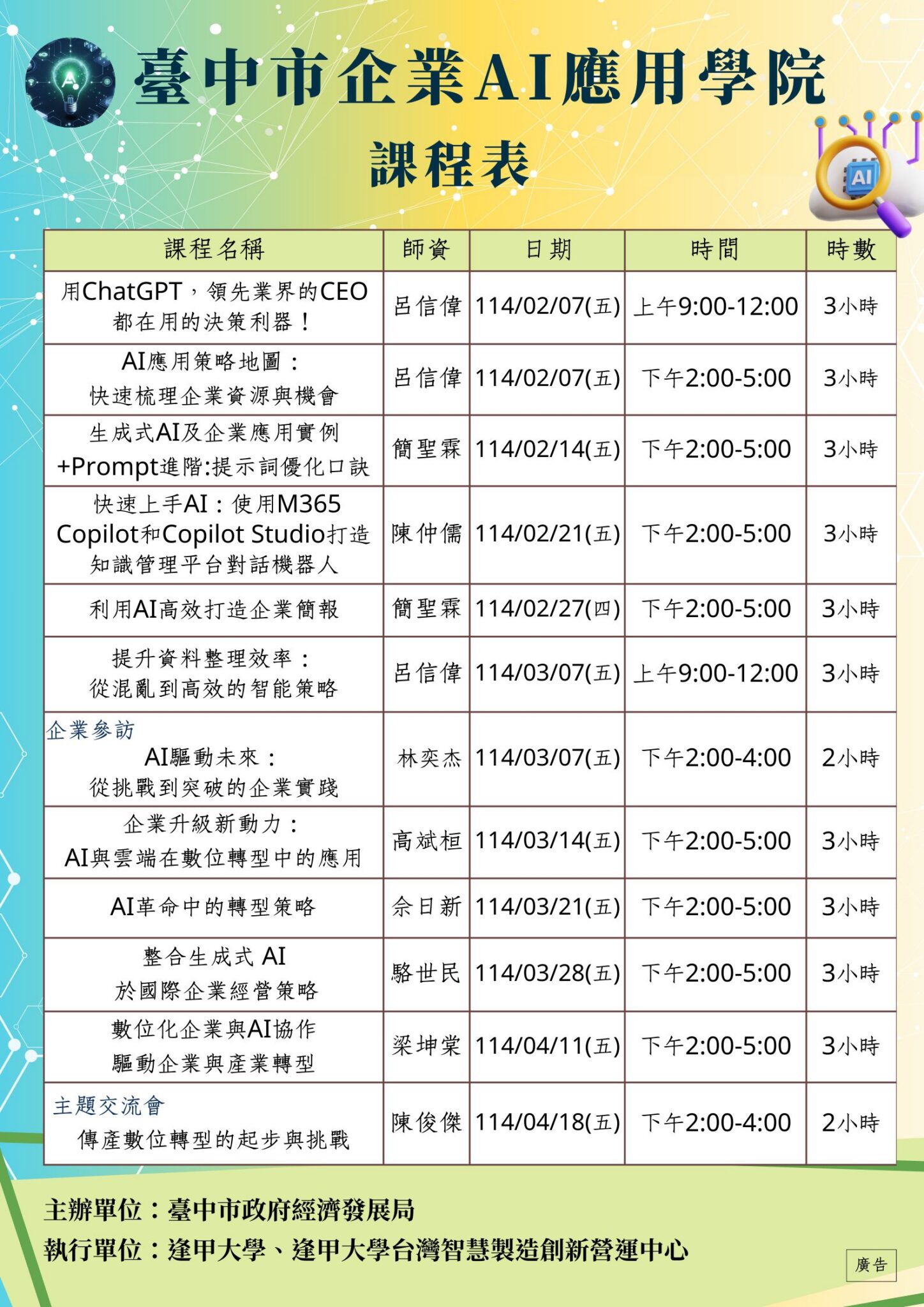 此次課程以AI實務應用與案例為導向規劃辦理,含10堂課程(30小時)、1場企業參訪(2小時)與1場主題工作坊(2小時),讓學員於課堂實操AI應用工具,即學即用,並規劃至導入AI應用工具之企業交流互動,瞭解AI工具於企業的應用情境,助力企業規劃AI數位藍圖,市府希望每一位企業主與管理者能找到適合自己產業的AI應用方式,為未來的市場競爭做好萬全準備。