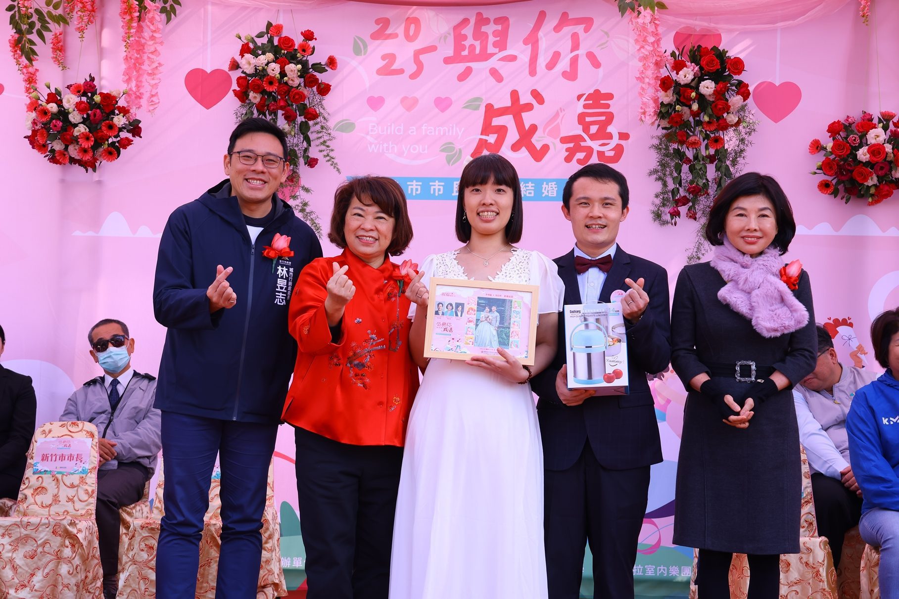 市長黃敏惠(左2)送上禮物,祝福新人早生貴子