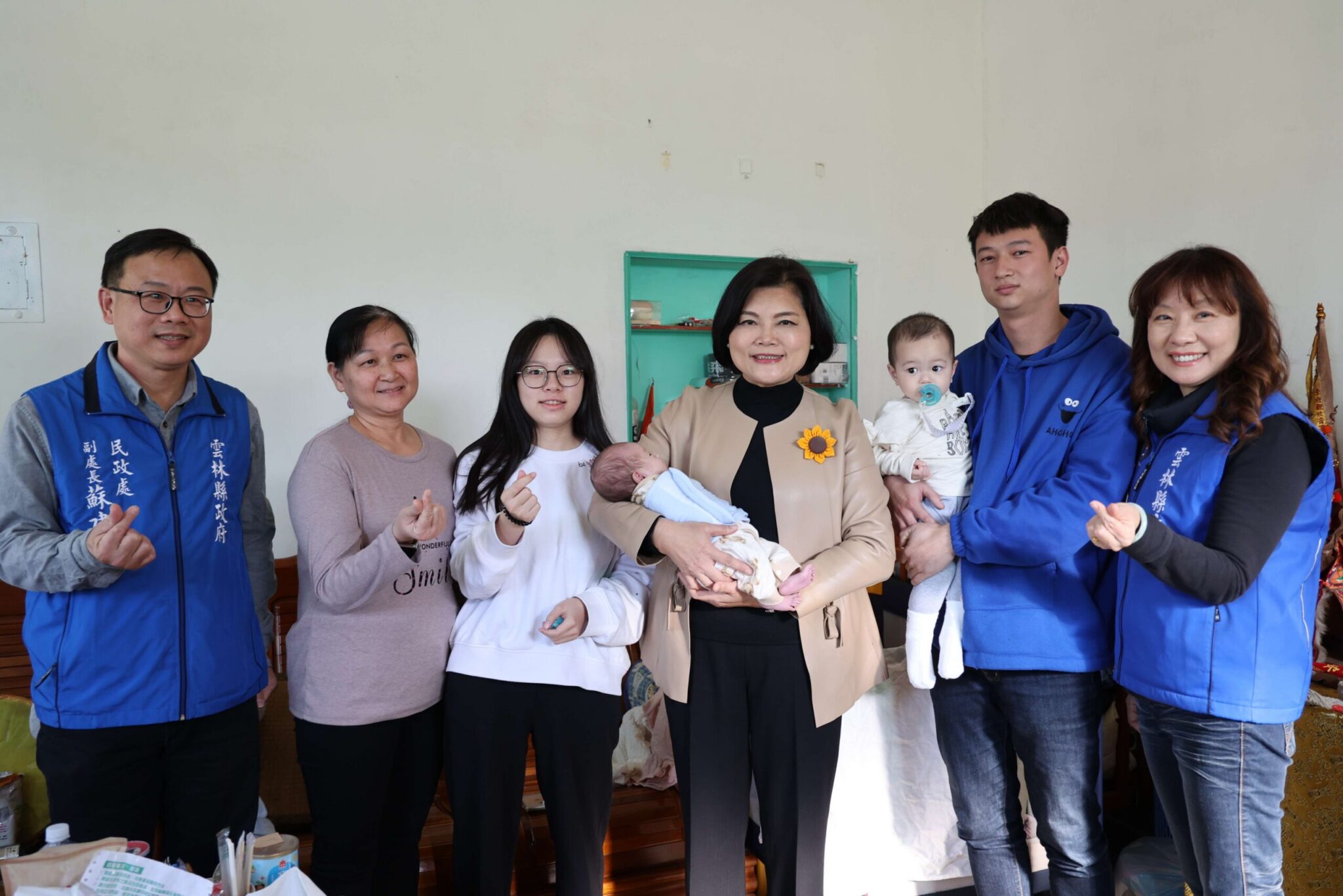 因應少子化趨勢,雲林縣政府祭出【兩年六億催生增產-雲林萬寶龍】計畫,推動成效佳,今(12)日下午縣長張麗善在縣府民政處副處長蘇建蒼、社會處副處長陳怡君等陪同下,前往斗六市重光里「雲林萬寶龍」第7,000位新生兒家中道喜。