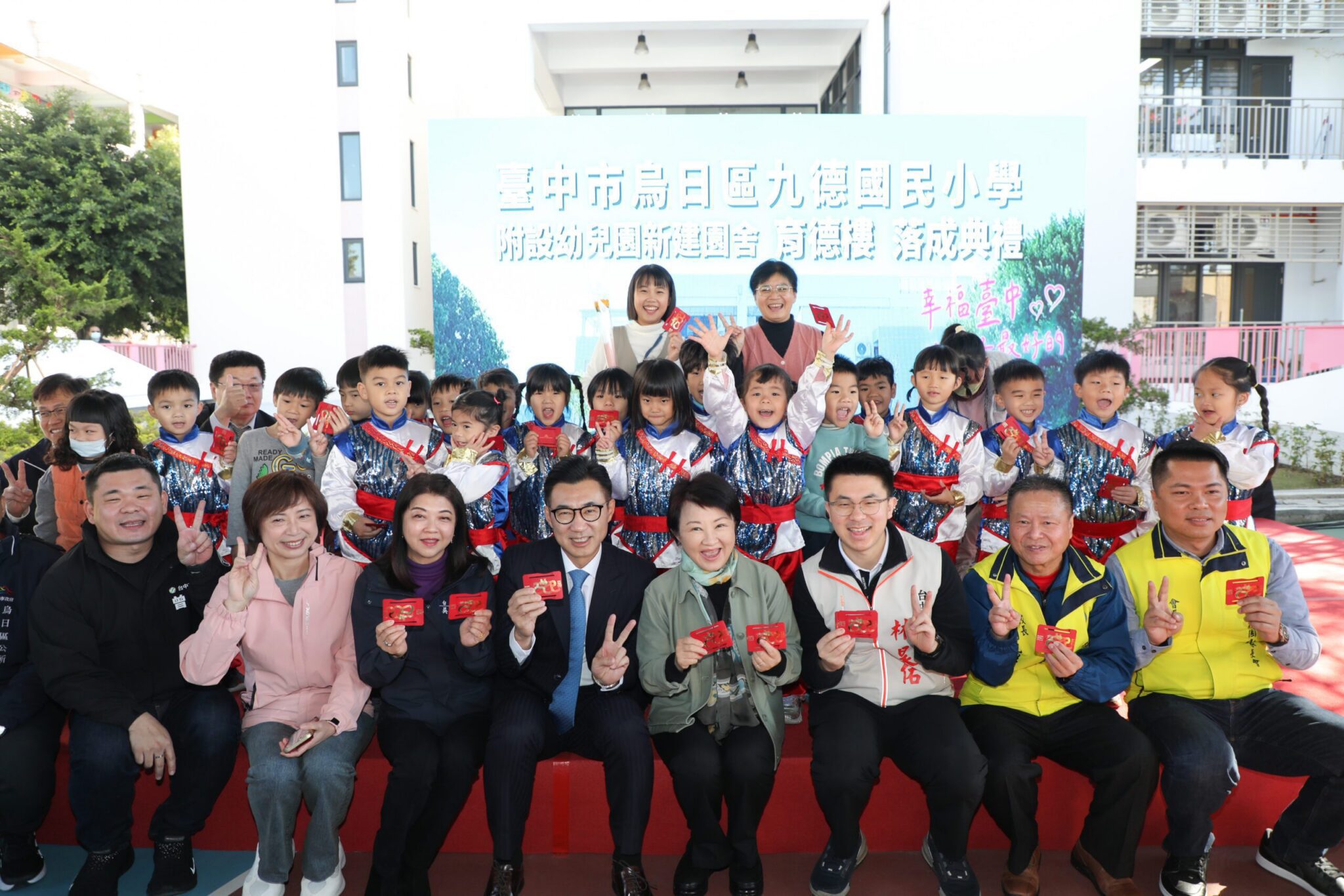 打造最幸福城市!為減輕家長負擔,讓烏日區幼生可享受平價優質的教保服務,台中市烏日區九德國小附設幼兒園今(13)日落成啟用,增加招收2歲幼幼班及3歲以上混齡班各3班。該新建園舍留設喬木及大量室外活動空間,讓孩童透過接觸自然素材訓練感知能力,更獲得2023國家卓越建設獎-金質獎,備受好評。市長盧秀燕出席啟用典禮時表示,自去年底起,台中各區多所公共化幼兒園新建校舍陸續落成啟用,是預見城市發展、人口增加,預先規劃的成果,感謝各界努力,「讓年輕人願生樂養」。