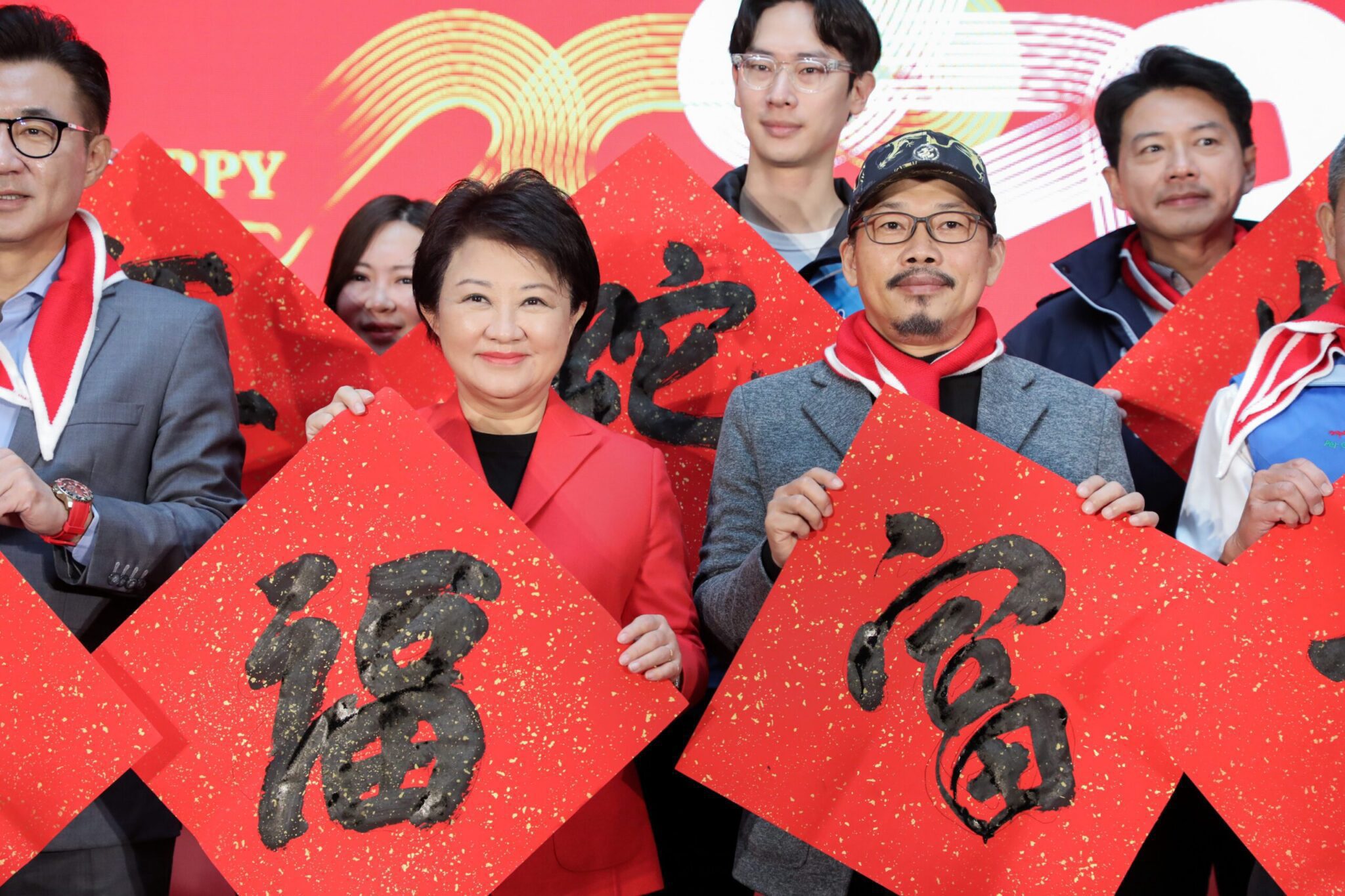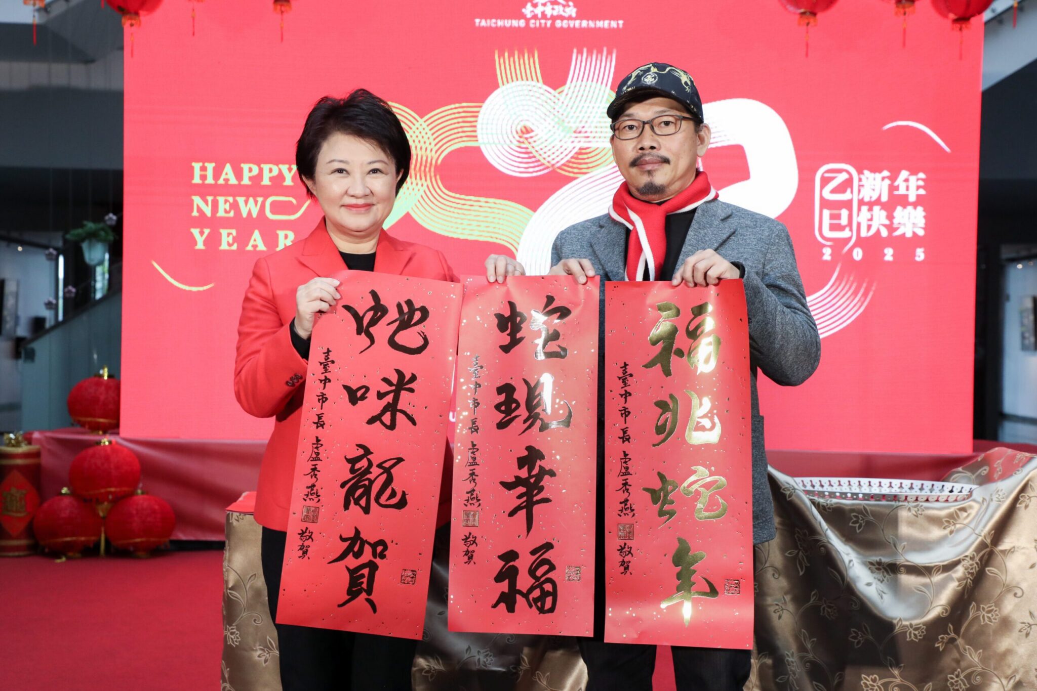 喜迎蛇年!為迎接新年的來臨,台中市政府今(15)日辦理「台中市政府114年迎新揮毫贈春聯」活動,並且首次跨界合作,特別邀請文藝創作界大師—方文山老師至現場與市長盧秀燕一同享受揮毫的樂趣!盧市長表示,今年的賀聯有2個驚喜彩蛋,一是邀請知名作詞人、藝術家兼市政顧問方文山執筆,為台中市書寫春聯;第二個彩蛋是今年除家戶版「蛇現幸福」春聯,另有2款隱藏版「福兆蛇年」及「蛇咪龍賀」限量發送!