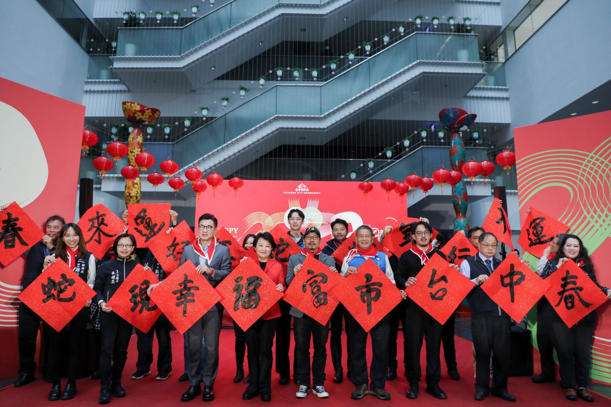 盧市長表示,台中市於去年底民調中榮獲全國最幸福的城市,城市已經實現幸福,今年市府特別選擇「蛇現幸福」當作家戶版的春聯,希望不僅城市幸福,家家戶戶都要幸福;另因去年限量版賀聯大受好評,今年加碼2款限量版,總共3款賀聯均是出自方文山老師之手,「蛇現幸福」將由各區公所發給各家戶運用;另2款「福兆蛇年」及「蛇咪龍賀」為限量款限量發送。此外,還有每年受到市民喜愛的創意春聯、紅包袋和10元紅包福袋。盧市長與方文山老師也於活動現場發放10元紅包福袋,民眾也難掩興奮之情,紛紛要求與他們合影、簽名。