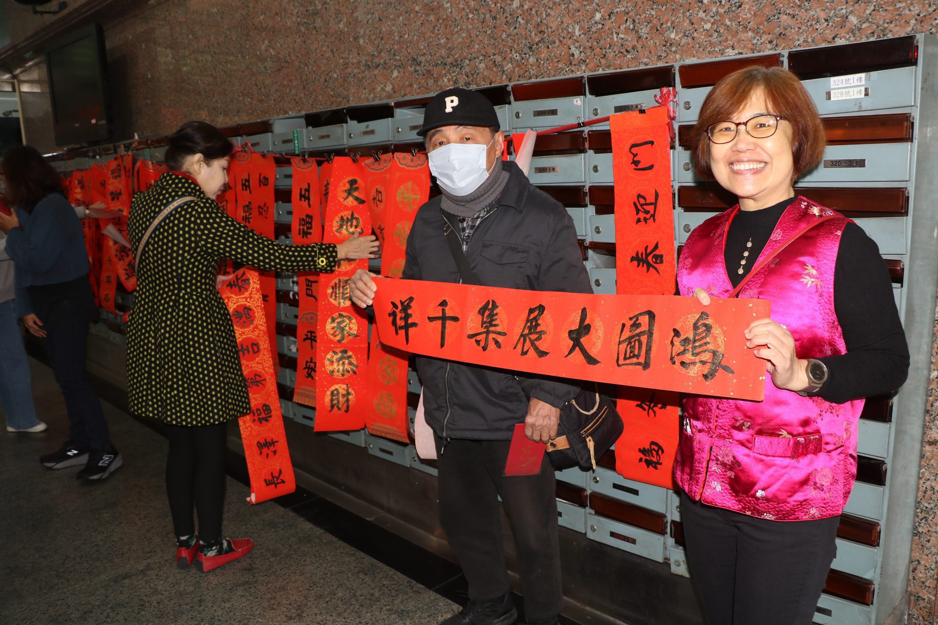 首都社區藉期末成果展舉辦寫春聯、贈春聯活動,不僅春聯,還有小紅包,學員用金墨寫上吉祥話,如平安如意、節節高升、蛇來運轉等,還巧心配上圖畫,如竹節、如意、金蛇等,住戶索取踴躍。