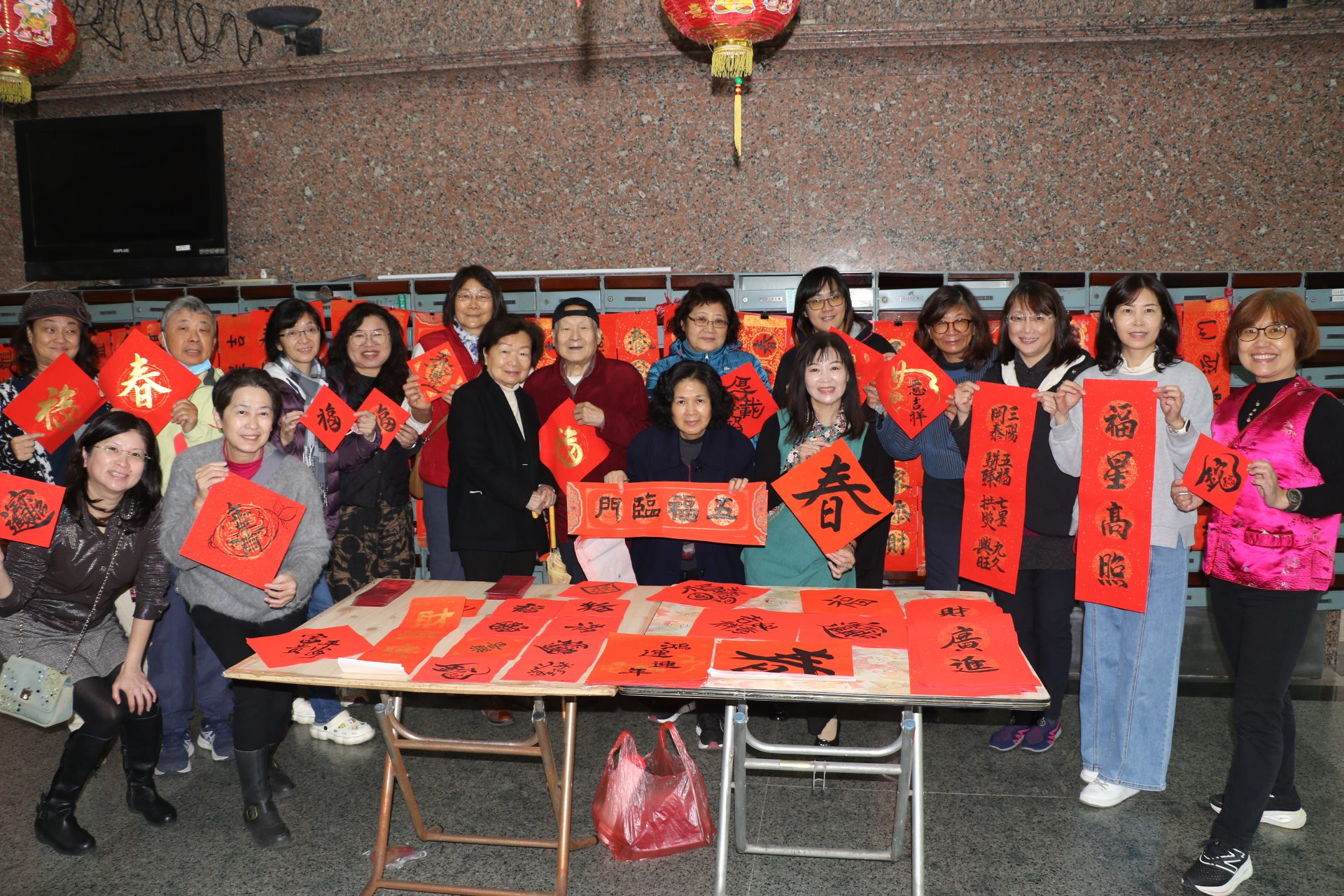 首都社區藉期末成果展舉辦寫春聯、贈春聯活動,不僅春聯,還有小紅包,學員用金墨寫上吉祥話,如平安如意、節節高升、蛇來運轉等,還巧心配上圖畫,如竹節、如意、金蛇等,住戶索取踴躍。
