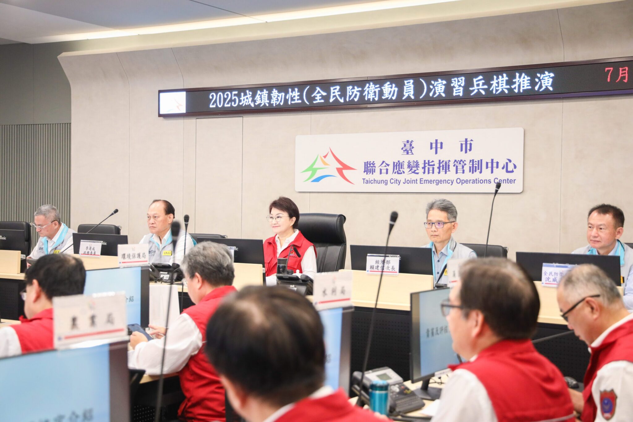 2025城鎮韌性演習今(15)日率先在台中登場,結合國軍漢光演習進程,市府團隊召集轄內重要機關單位,整合全民防衛動員、防空及關鍵基礎設施3項演習,展現市府防災與戰備整合應變能力。市長盧秀燕上午主持兵棋推演表示,台中曾歷經921大地震、新冠疫情及百年大旱等考驗,累積豐沛的應變能量,城市安全沒有最好、只有更好,我們要做好最壞打算,讓市民生命財產損失降到最低。