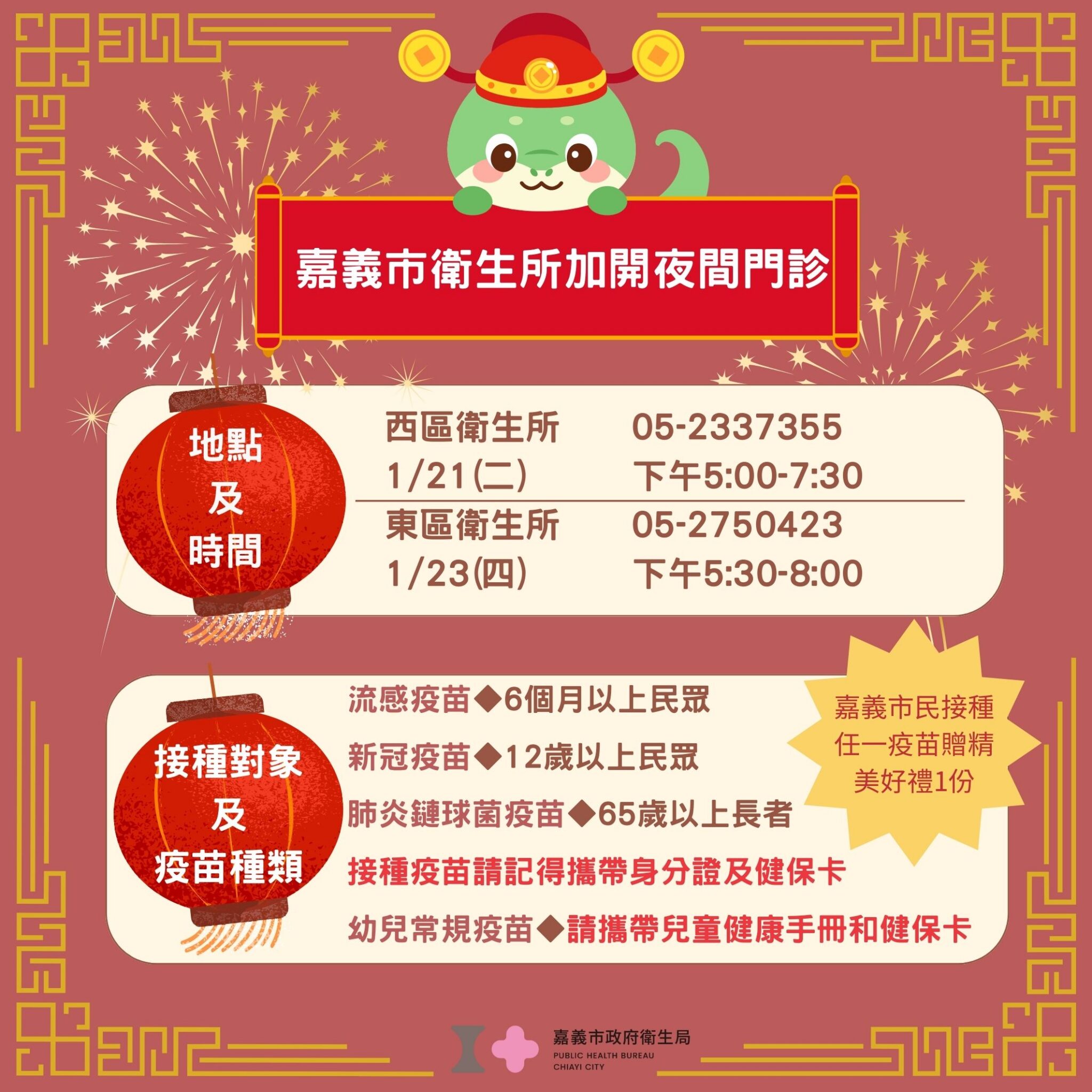 年關將近,民眾出遊、返鄉探親等活動頻繁,且寒流持續發威,嘉義市衛生局提醒民眾注意保暖及留意自身健康狀況,為維護市民健康,嘉義市東、西區衛生所特別加開2場夜間門診,分別於1月21日(周二)下午5:00-7:30在西區衛生所、1月23日(周四)下午5:30-8:00在東區衛生所,提供流感、新冠、肺炎鏈球菌和幼兒常規疫苗接種服務。