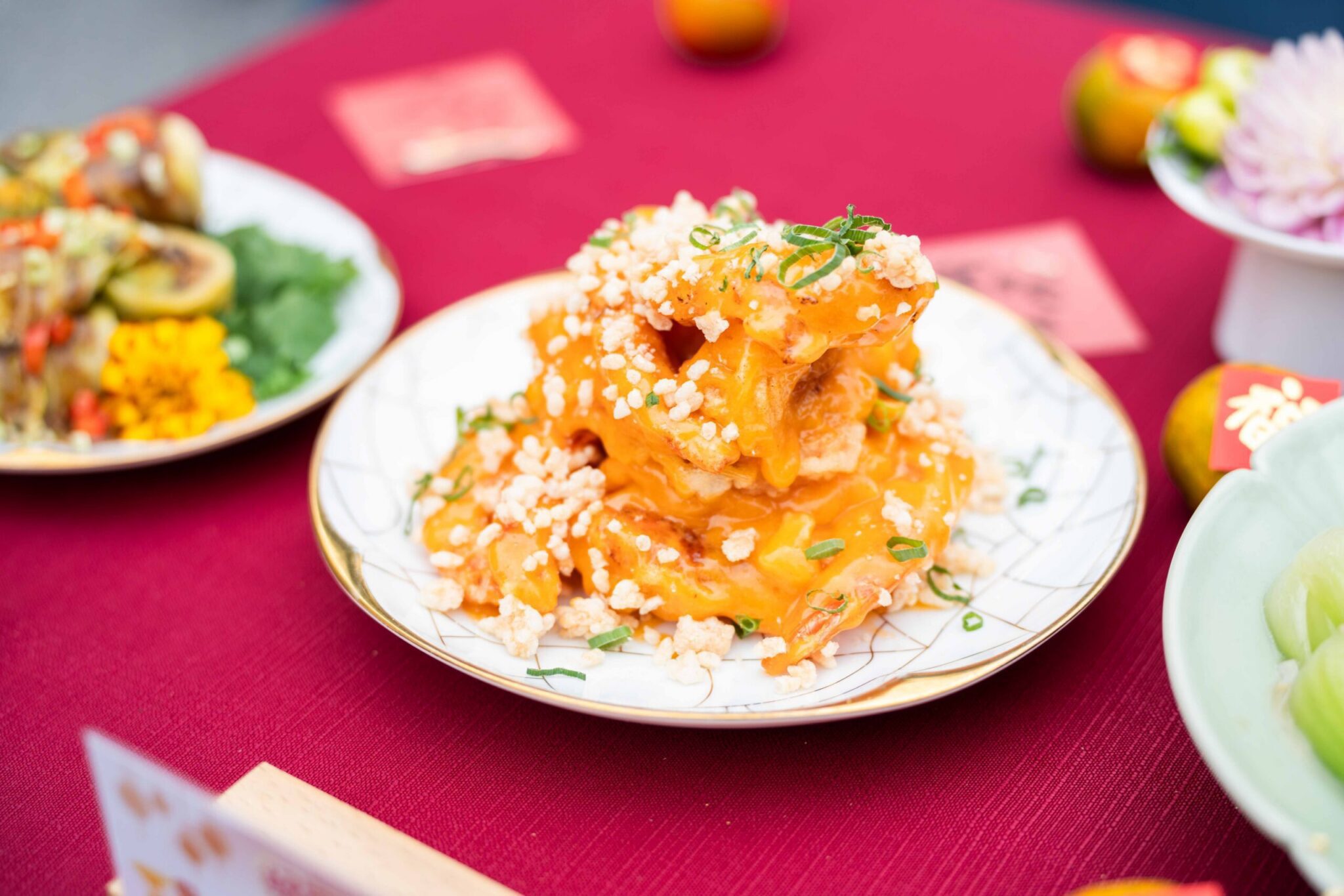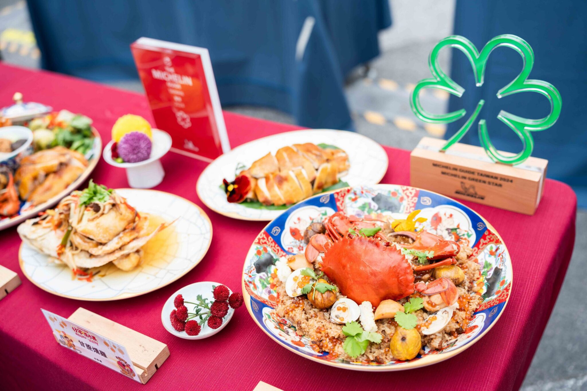米其林餐廳「山海樓」行政主廚蔡瑞郎端出「紅蟳極品海鮮米糕」,嚴選產地直送的紅蟳、鮑魚、中卷、蛤蜊、蝦乾等海味,融合段木香菇、鬆軟栗子與Q彈糯米,將山珍海味融合得恰到好處,餐盤上滿滿的海鮮猶如一場嘉年華會;此外,還有「甘蔗燻雞」、「五柳枝鮮魚」等經典名菜連番端出,引起現場觀眾驚呼連連。