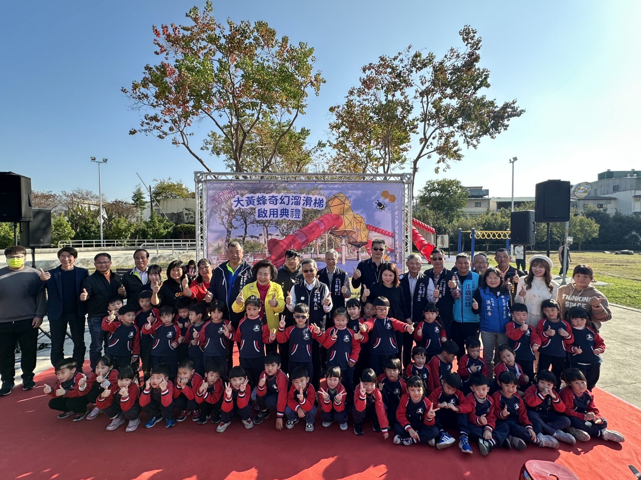 此外,市議員林碧秀為讓地方民眾一起開箱感受遊戲場的歡樂,在日前舉辦「揪里來𨑨迌 杙童FUN峰-大黃蜂奇幻溜滑梯啟用典禮」,吸引周邊居民熱情參加,包含大里區長鄭正忠及在地各里長均到場同樂,立法院副院長江啟臣也派代表共襄盛舉,與市民朋友一同感受特色遊戲場的樂趣。
