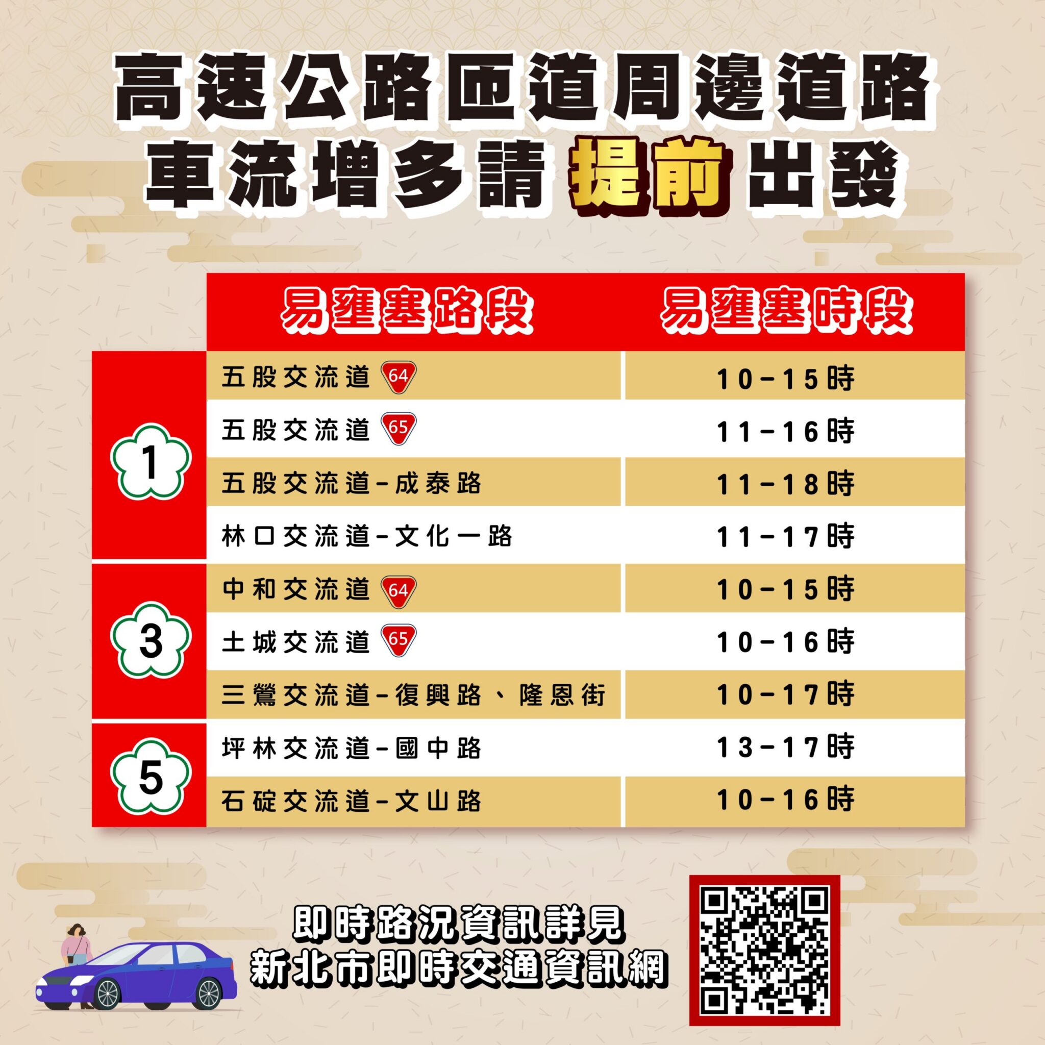 春節即將到來,新北市交通局推出「新北市春節連假交通懶人包」,提供春節期間新北市境內國道匝道管制、風景區及廟宇大眾運輸、2025新北燈會及平溪天燈節等活動交通資訊,讓你行的順暢,開心過好年。