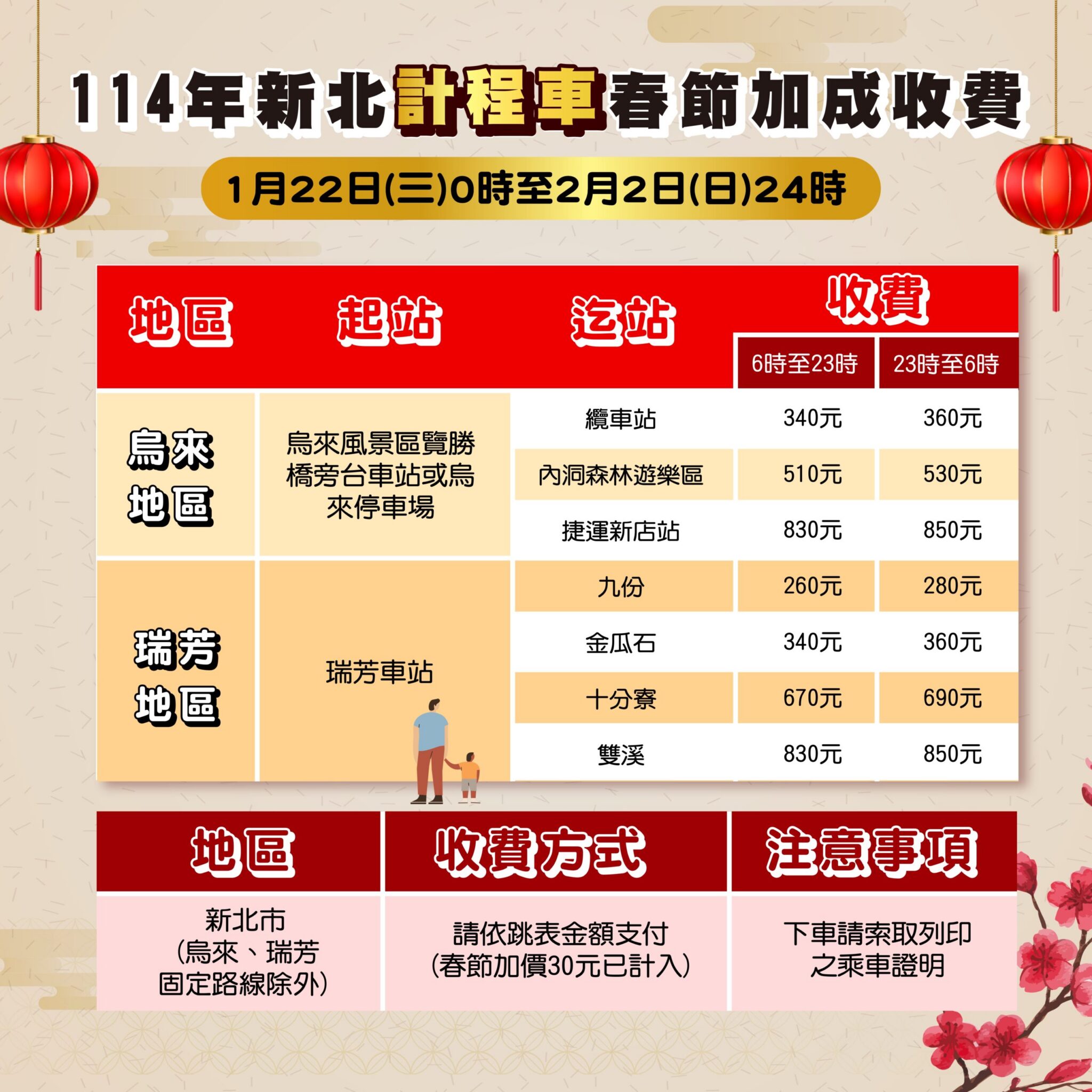交通局表示,新北市計程車春節加成收費將自春節連假前3天起,即自1月22日(三)0時起至2月2日(日)24時止共計12天實施,春節加收30元已計入跳表,與北市、基隆同步實施,請搭車民眾依跳表金額支付車資,並可於下車前索取乘車證明,當場確認收費金額;瑞芳及烏來固定路線則依現場公告春節運價收費。