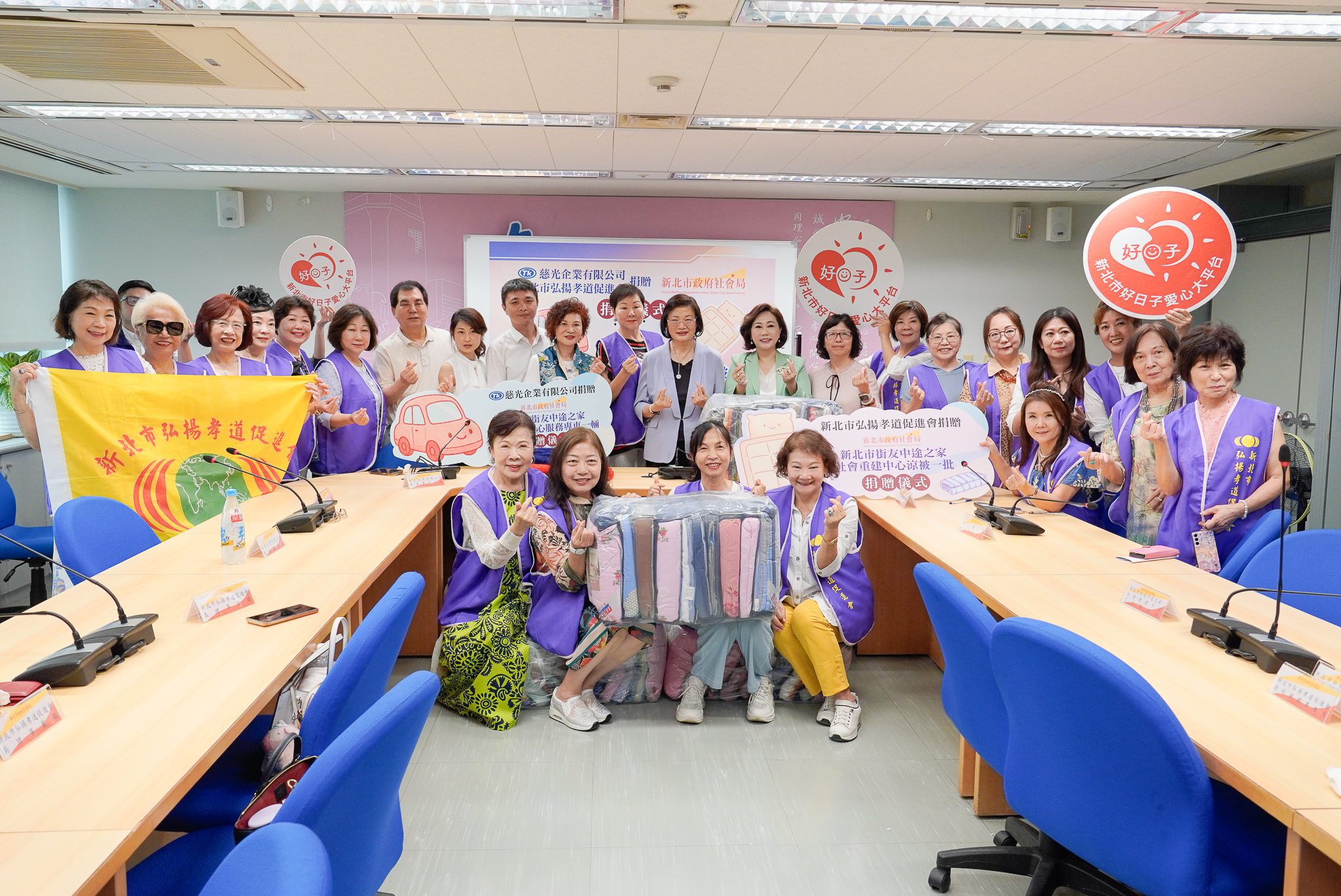 慈光企業董事長鄭玉廷攜手新北市弘揚孝道促進會捐贈1輛「社會重建中心服務專車」、60件涼被及多件圍巾。(新北市社會局提供)