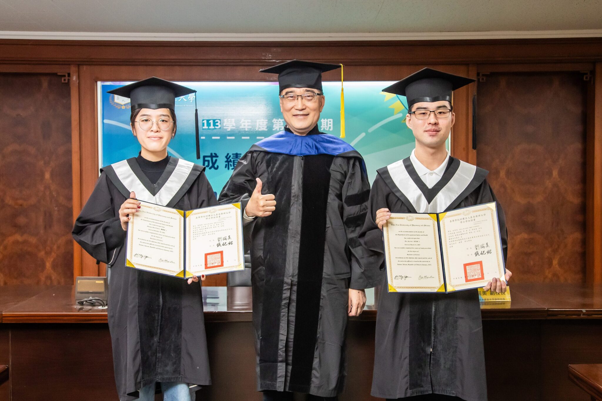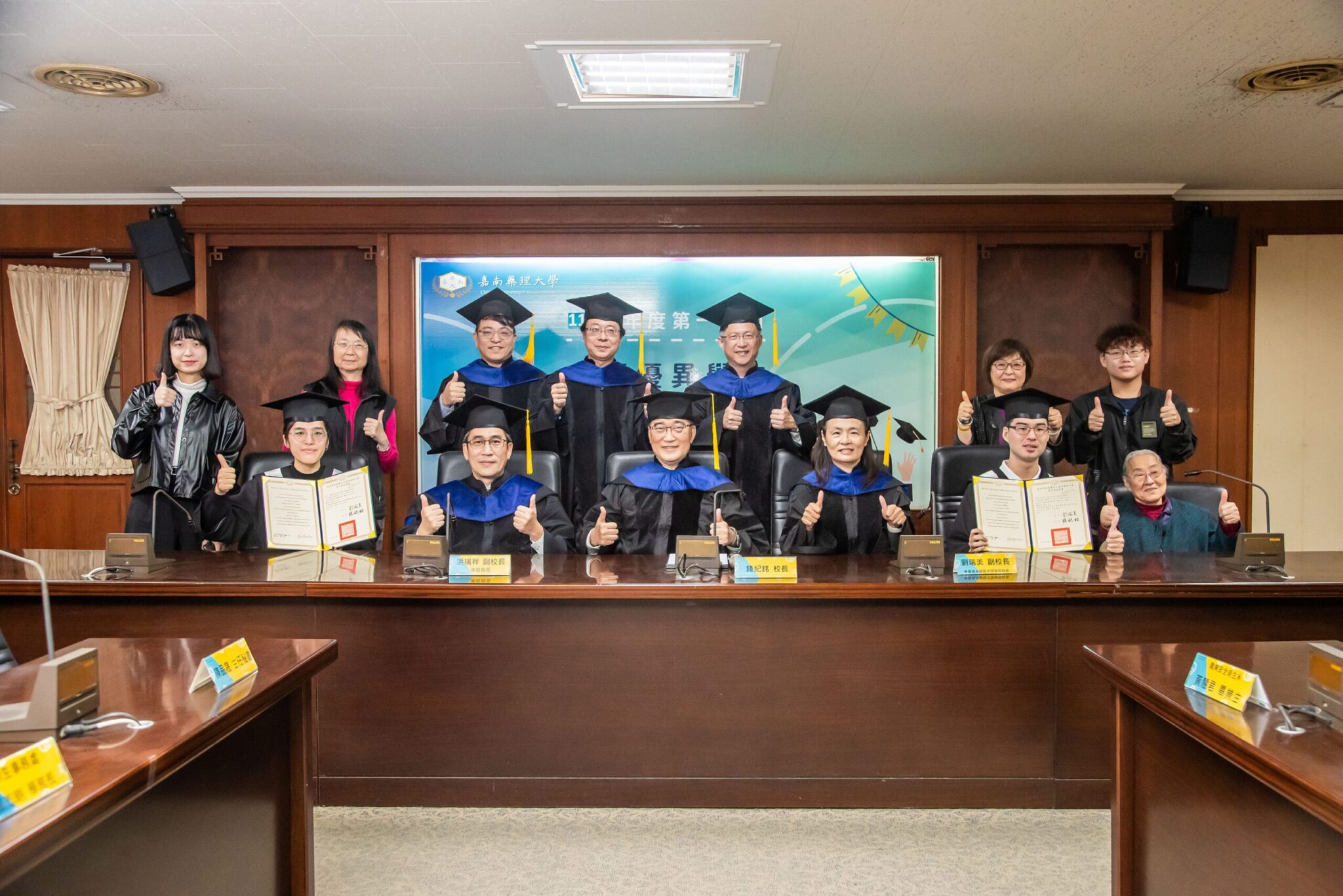 農曆年前,嘉南藥理大學迎來金蛇年第一樁喜事,今天為成績優異提前畢業的職業安全衛生系何芮安及黃慧君兩位學生,舉辦了一場溫馨隆重的微型畢業典禮。校長錢紀銘親自為二位學生撥穗並頒發畢業證書,二位學生親屬與多位職安系師長也到現場,為這兩位優秀學子送上滿滿祝福。