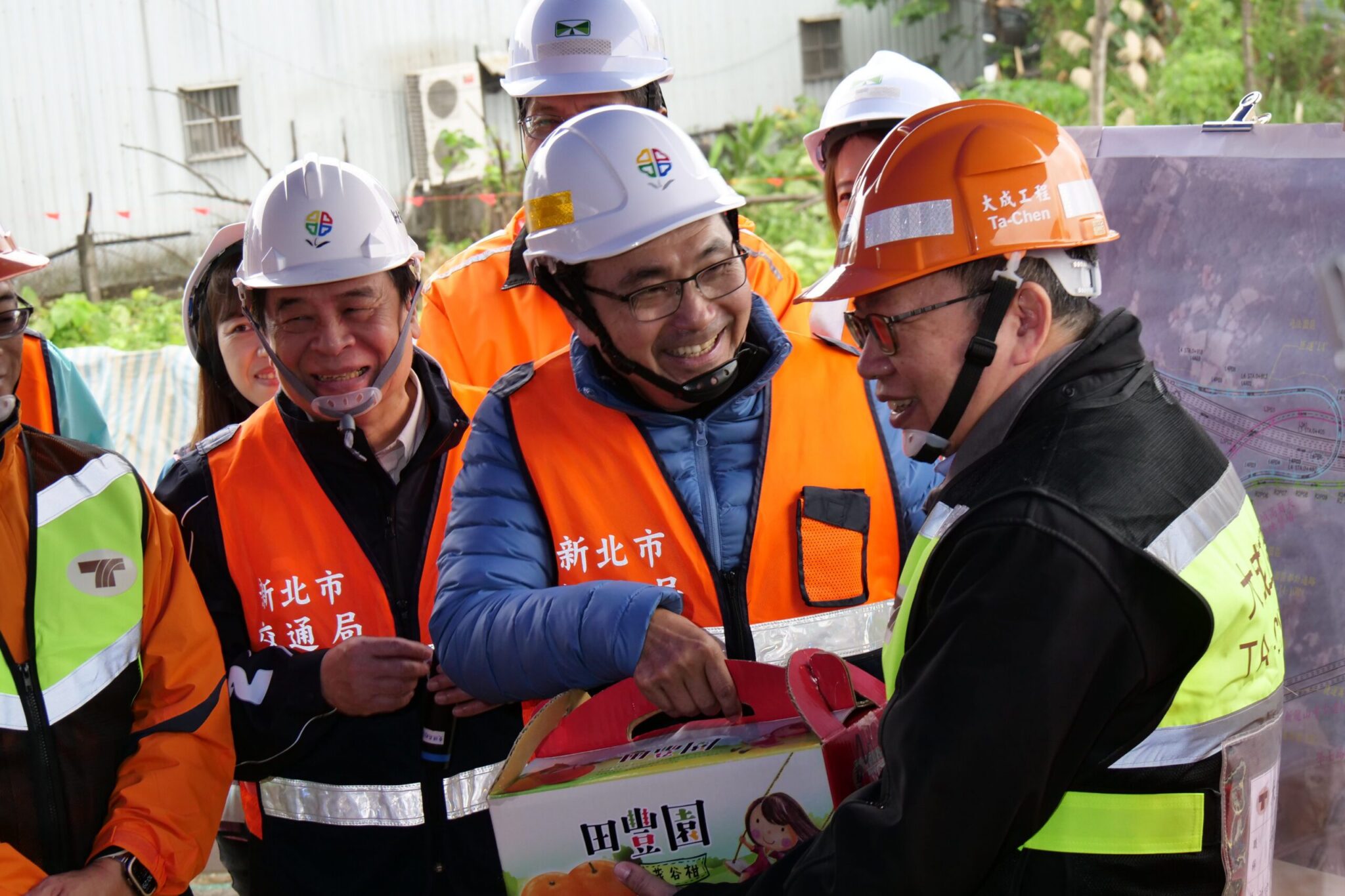 金城交流道工程在前(112)年10月30日開工,截至本(1)月15日,工程預定進度16.16% 實際進度則超前為17.9%,侯友宜致贈春聯及水果禮盒慰勞施工團隊,表達感謝之意,也期許116年5月底如期完工,將可提升國道主線和土城地區聯絡道路運轉效率。