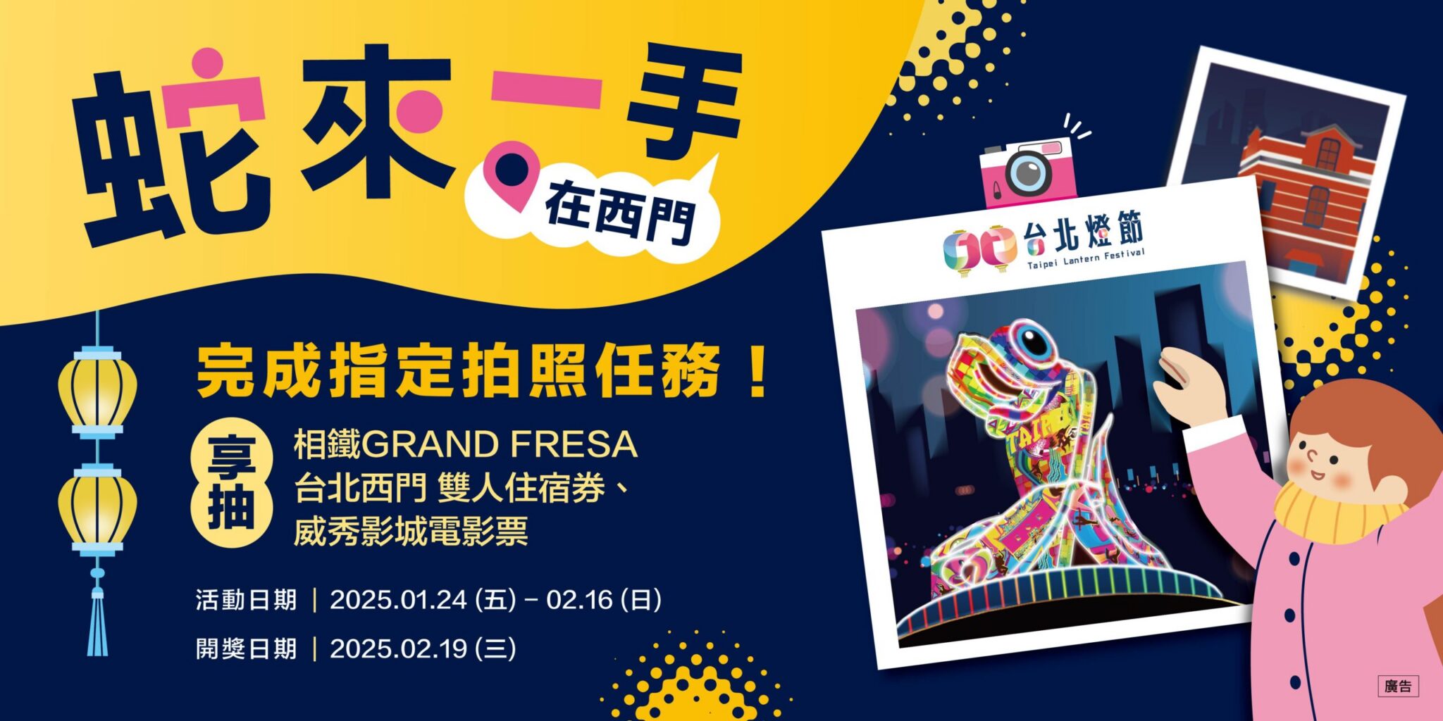為迎接燈節光廊亮燈,觀傳局推出「蛇來一手在西門」指定拍照任務活動,即日起至2月16日,擺出蛇手姿勢,與任一台北燈節燈組合影並上傳臺北旅遊網指定活動貼文,並留言「#蛇來一手在西門」和「#2025台北燈節」,就有機會抽中西門町商圈周邊飯店雙人住宿券或電影票!此外,台灣高鐵響應本次台北燈節,也舉辦「台北燈節蛇來運轉 萬華美食走讀」專業導覽,並與18家旅館合作推出高鐵與住宿的超值優惠。更多高鐵假期相關優惠請上官網(連結) 查詢。
