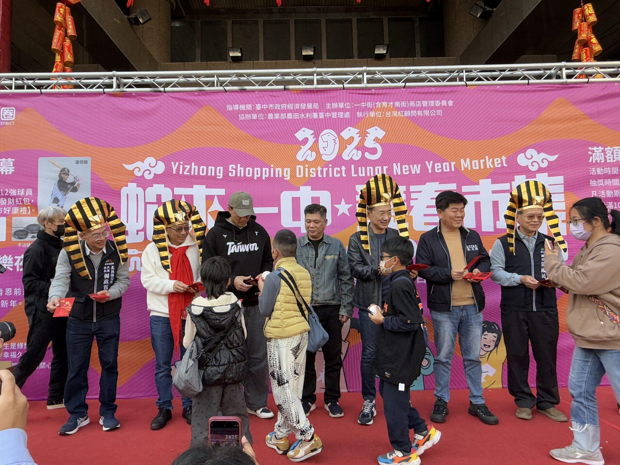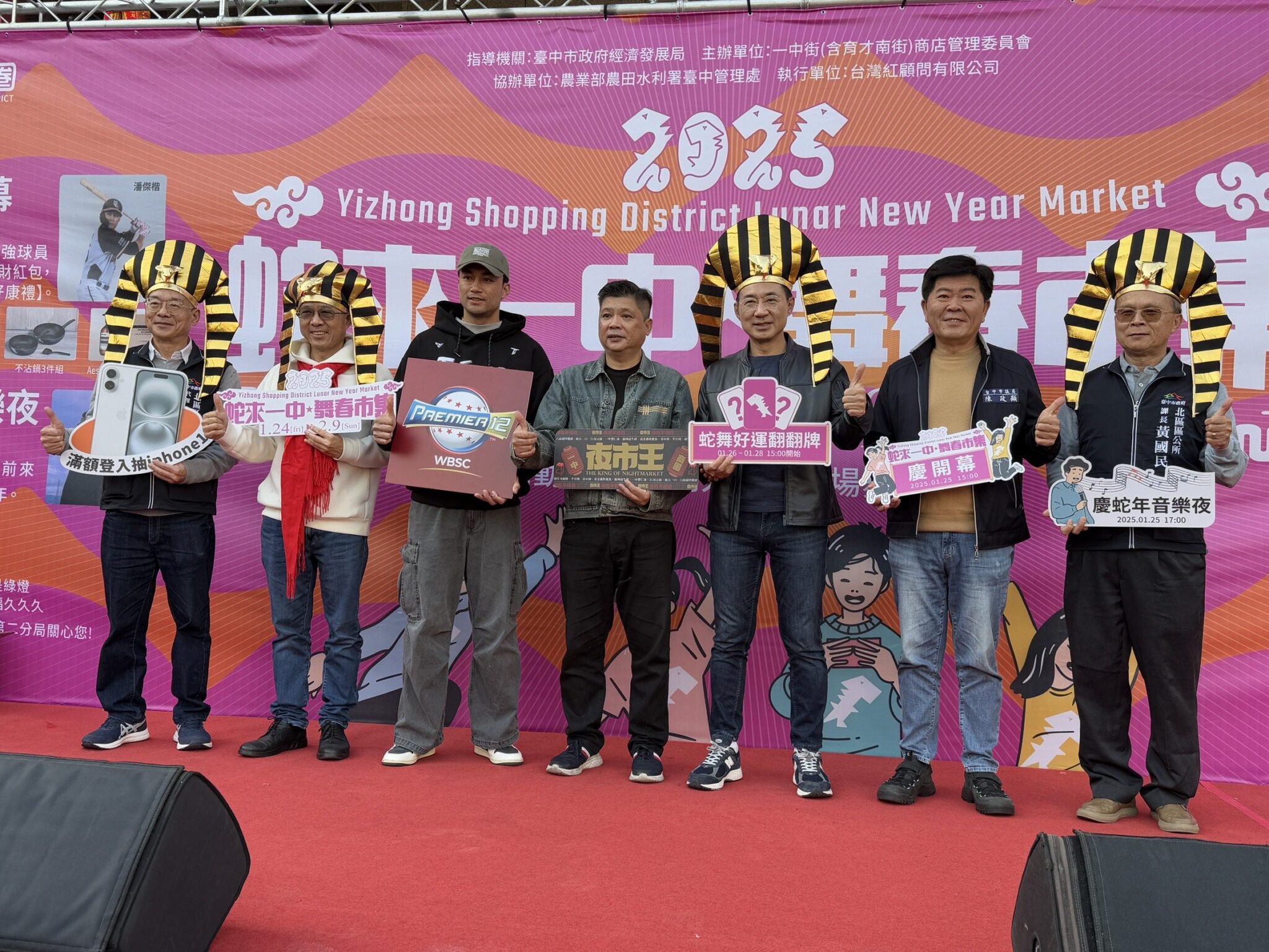走春好去處!台中一中商圈即日起至2月9日舉辦為期17天的「蛇來一中‧舞春市集」活動,今(25)日於水利大樓前廣場舉行開幕式,特別邀請Premier 12棒球賽事冠軍球員-潘傑楷現身站台,與市府經發局長張峯源及貴賓一同發送888份新春紅包,還推出消費滿百享摸彩、好運翻牌送商圈消費券等活動,歡迎大家到一中享用美食節目《夜市王》競賽美食、走春、購物,蛇年好運旺旺來。
