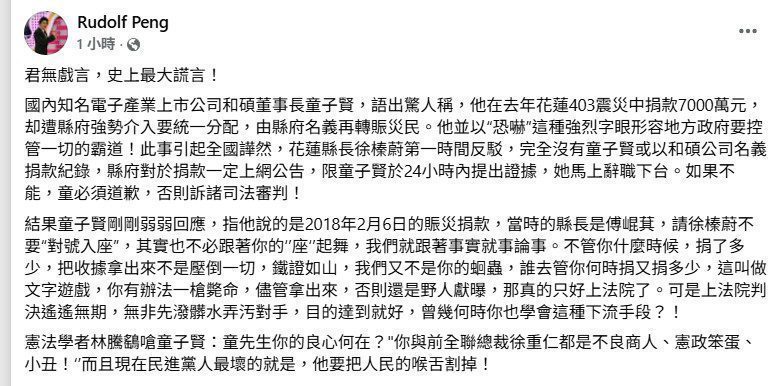 圖說:和碩聯合科技董事長童子賢自爆他個人及公司捐出七千多萬元賑災花蓮,縣府查不到,資深媒體人彭華幹在臉書發文,要童子賢把捐款收據拿出來讓人一槍斃命,不要玩文字遊戲!圖/翻攝彭華幹臉書