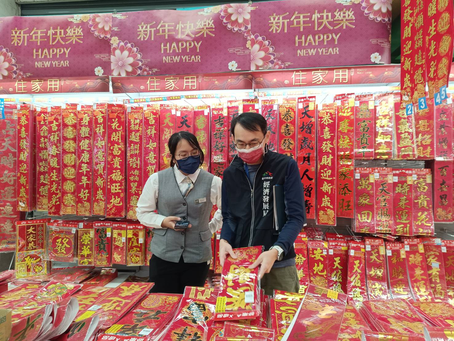 經發局說明,為因應春節採買需求,部分賣場規劃年節檔期促銷活動,並設置年節商品及年貨禮盒專區,市府經發局人員前往家樂福、大潤發、楓康、全聯及新光三越百貨等,針對紅包袋、春聯、掛飾、玩具、衣服、童裝、手機殼及3C產品等春節應景商品進行商品標示抽查,抽查商品數量130件,均符合規定,並於現場向店家宣導販售商品均應遵守商品標示法相關規定。