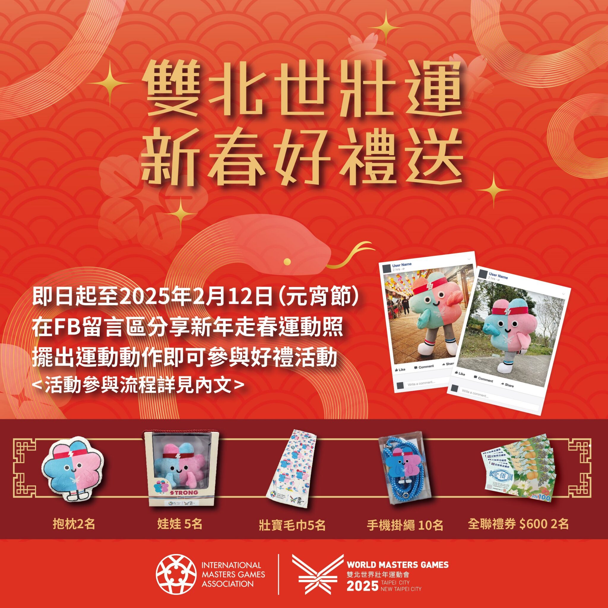 除夕夜喜迎新春,2025雙北世界壯年運動會為了增添年節氣氛,臺北市政府觀光傳播局特別準備多項壯寶好禮特別推出「新春抽獎活動」,並提醒全球運動愛好者,賽事即將於今(114)年2月17日截止報名,正進入最後倒數階段,別錯過參與這場國際盛事的機會!