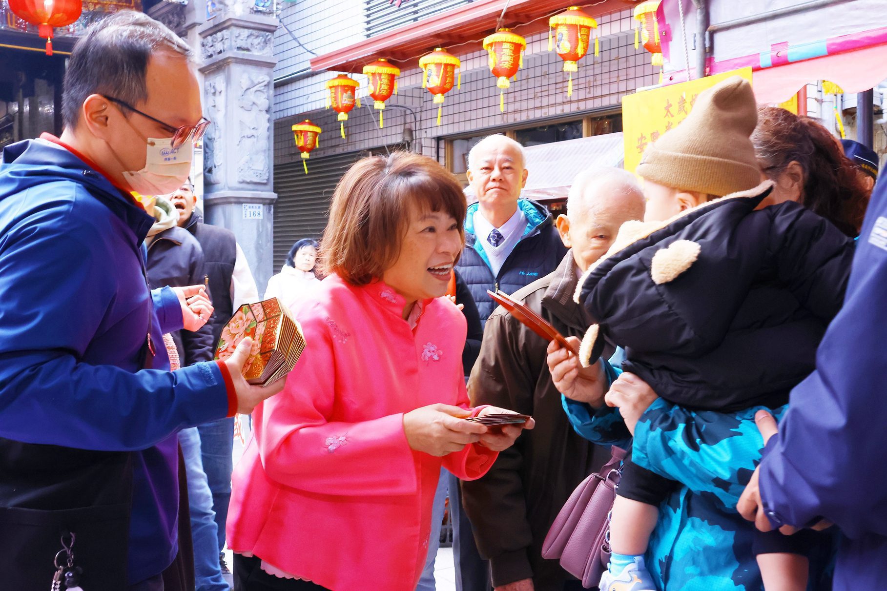 黃敏惠身穿喜氣紅裝,親切地與每一位前來領紅包的市民合照、握手,傳達新年祝福,並特別介紹新年紅包以「百寶盒」為設計靈感,盒內包含象徵好運的「七龍珠」,當抽起中間的金色明珠,不僅能看到寫著「大吉」字樣的籤文,更能看到鑄有「國泰民安」的硬幣,象徵著對新年的美好祝福。