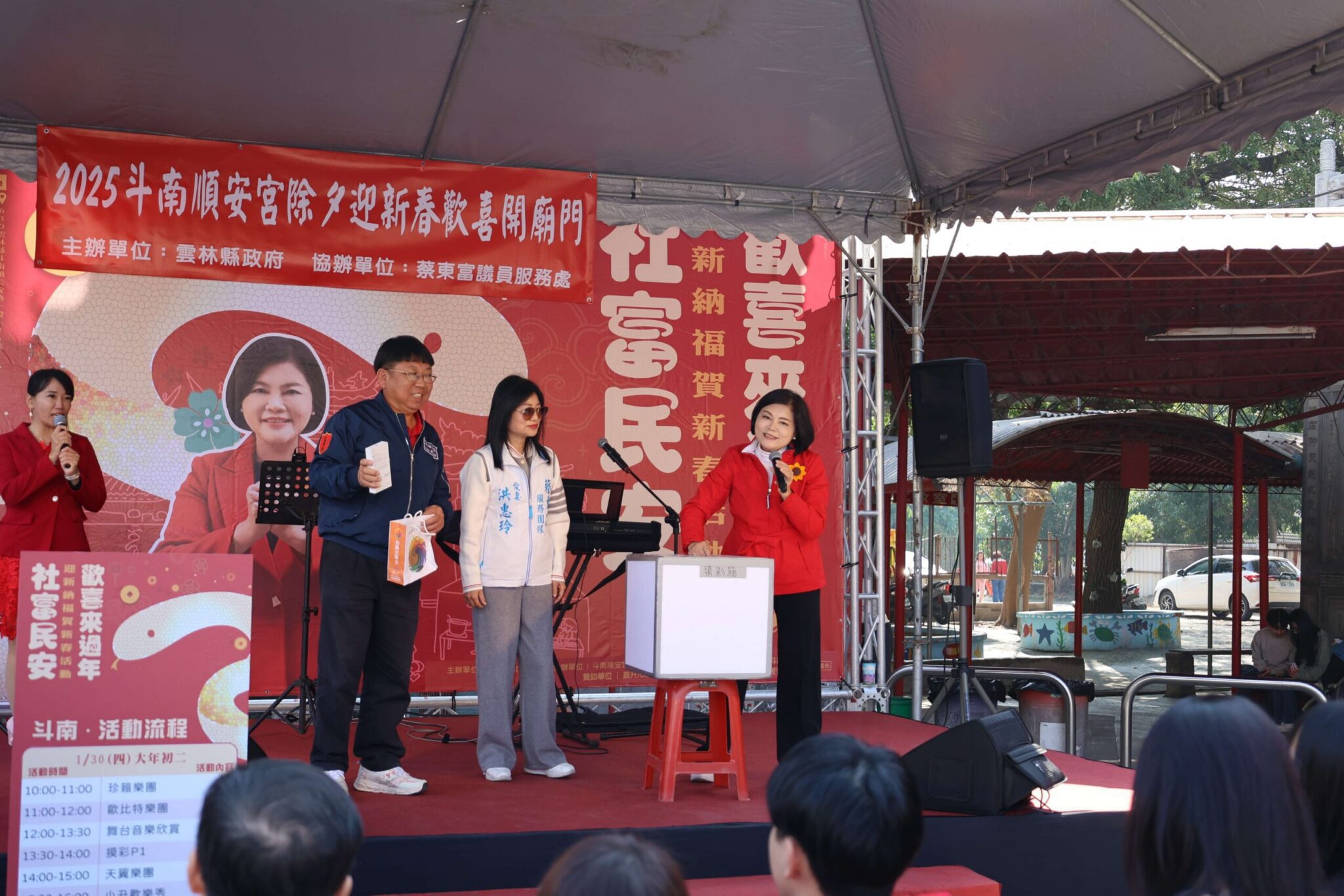 縣長張麗善指出,春節期間各廟宇特別熱鬧,許多人會來上香祈福,所以今年縣府首次在斗南順安宮及土庫馬光順安宮舉辦「歡喜來過年」活動,透過50、60年代過年時廟口童玩遊戲與復古零嘴,把團圓走春的歡樂氣氛找回來。