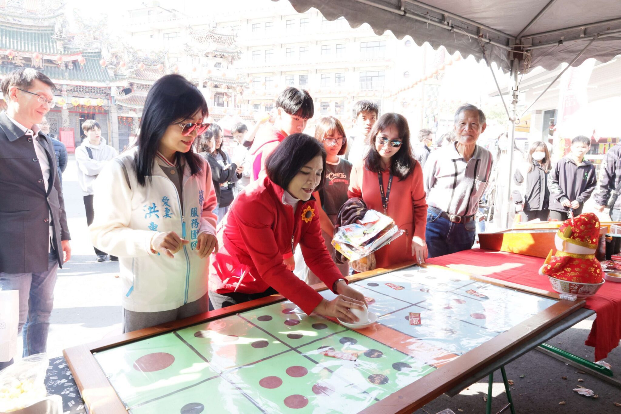 今日下午張麗善在斗南順安宮前廣場,除為活動抽出iPhone、iPad獎項得主,還到各攤位與民眾同樂,體驗傳統博弈遊戲、品嘗小吃,許多民眾看到她紛紛上前合照,互動熱烈。