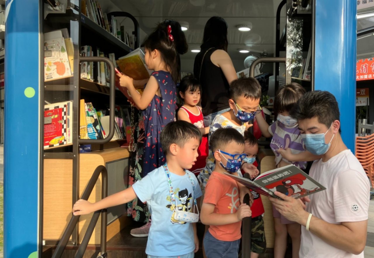 行動圖書車提供駐點閱讀服務,提供大小朋友享受閱讀樂趣