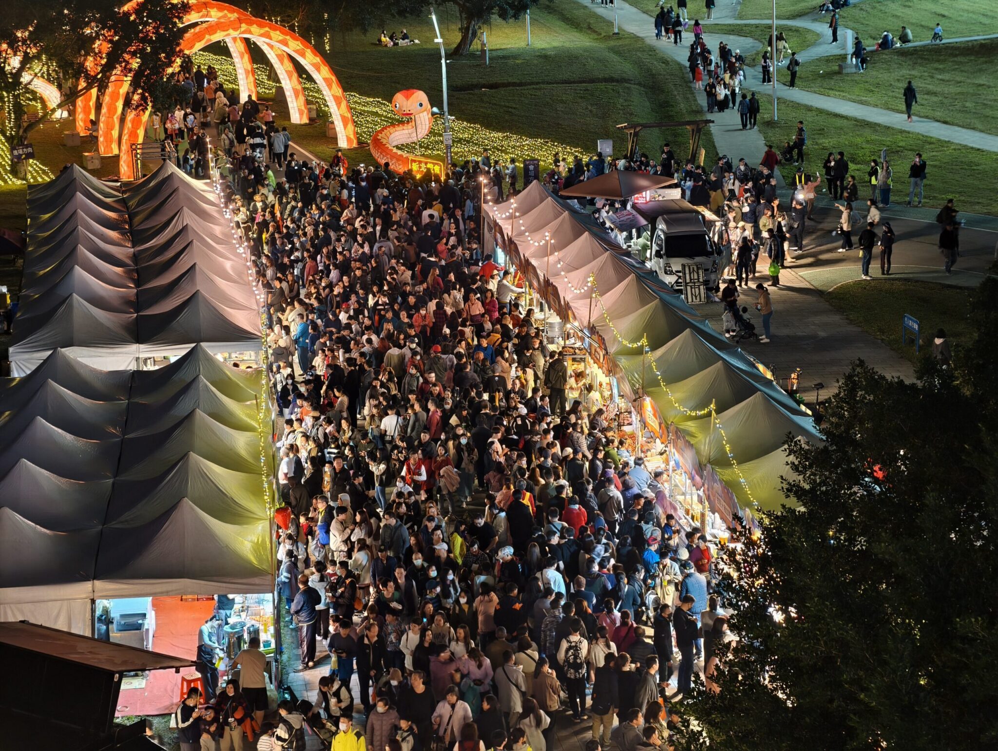 侯友宜表示,今年燈會「靈蛇獻瑞 一起PLAY」在新北大都會公園登場,迎來了日韓、江蘇的特色燈籠,燈區比去年大了兩倍,還有各區精神象徵的花燈。即日起至2月16日,10大主題燈區、6大主題活動、近120攤的「蛇麼都有市集」要讓大家好好過新年,直到元宵節。