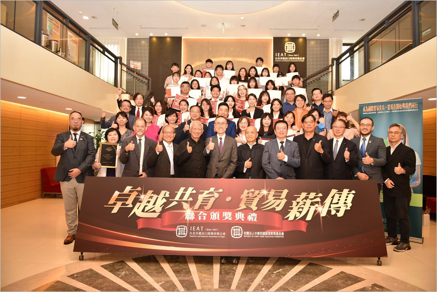 7月25日舉辦的「卓越共育.貿易薪傳」貿易教育聯合頒獎典禮,集結「傑出國貿人才獎學金」、「國貿教育卓越教學獎」與「第20屆國貿大會考獎學金」三大獎項,由IEAT貿易教育委員會陳欽祥主任委員主持,表揚在貿易教育領域績優老師、業師,與傑出學生代表,活動邀請產官學界代表及全國多所學校師生共襄盛舉,現場氛圍熱烈。