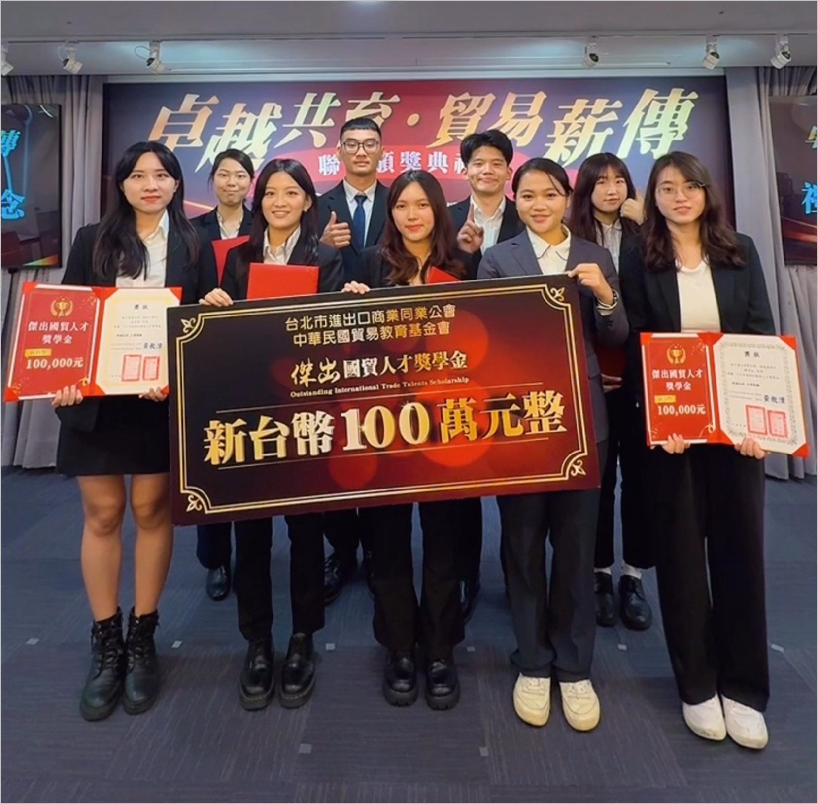 「傑出國貿人才獎學金」今年選拔出10位來自碩博士組與大學組的優秀學生,包括政治大學蔡家卉、臺灣科技大學洪珮軒、台灣大學吳易儒、中山大學劉瀚智、賴一鈞;東吳大學楊凱婷、台中科技大學詹鈞崴、台北商業大學陳彥如、東海大學陳芷怡與來自俄羅斯的外籍生東海大學杜雨杉。每位獲得新台幣10萬元,共計發出100萬元獎學金。