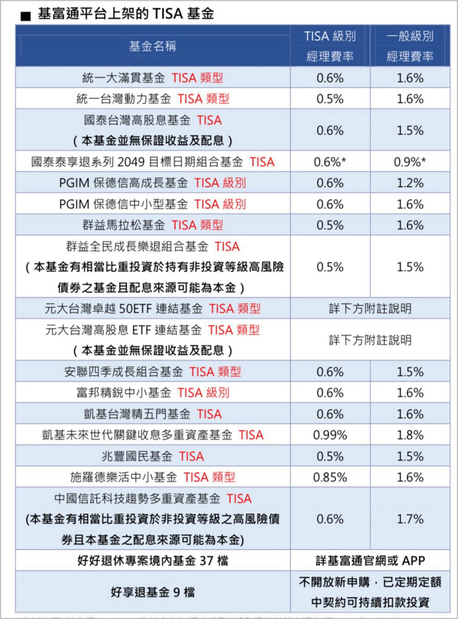 除了「TISA好享投」之外,基富通「好好退休準備平台」服務今年持續升級,新增景順多元收益成長基金、景順環球股票收益基金、施羅德環球創新股票基金,境外基金數量達到23檔,同樣有專家把關、費用低廉,加上小額保險商品與全平台總計近5,000檔基金,將能補足TISA僅境內基金的不足之處,滿足民眾一站理財與資產配置需求。