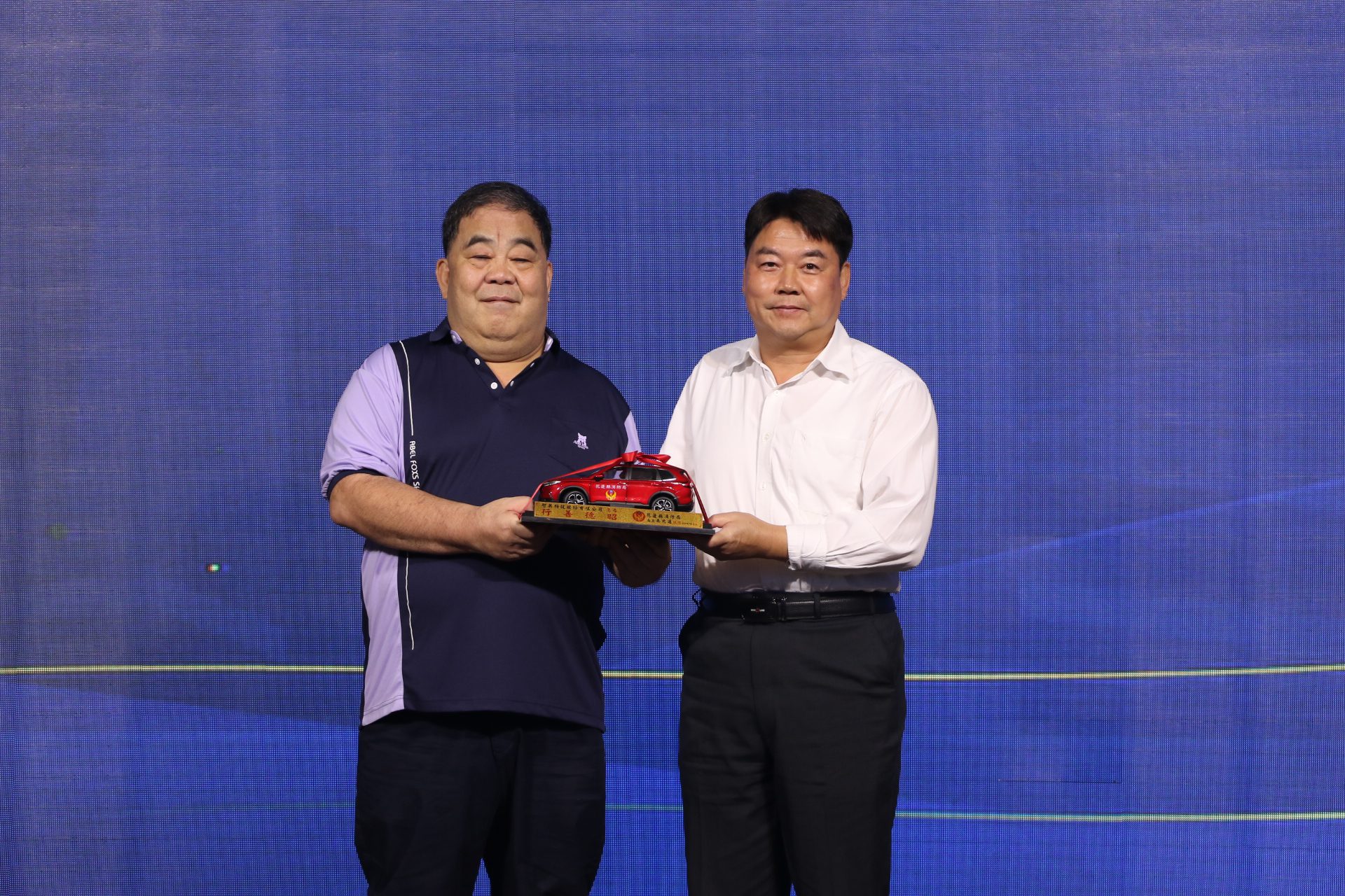 智英科技董事長林宴臨(左)代表捐贈災情勘查車給花蓮縣消防局,由局長吳兆遠代表受贈。(新北市社會局提供)