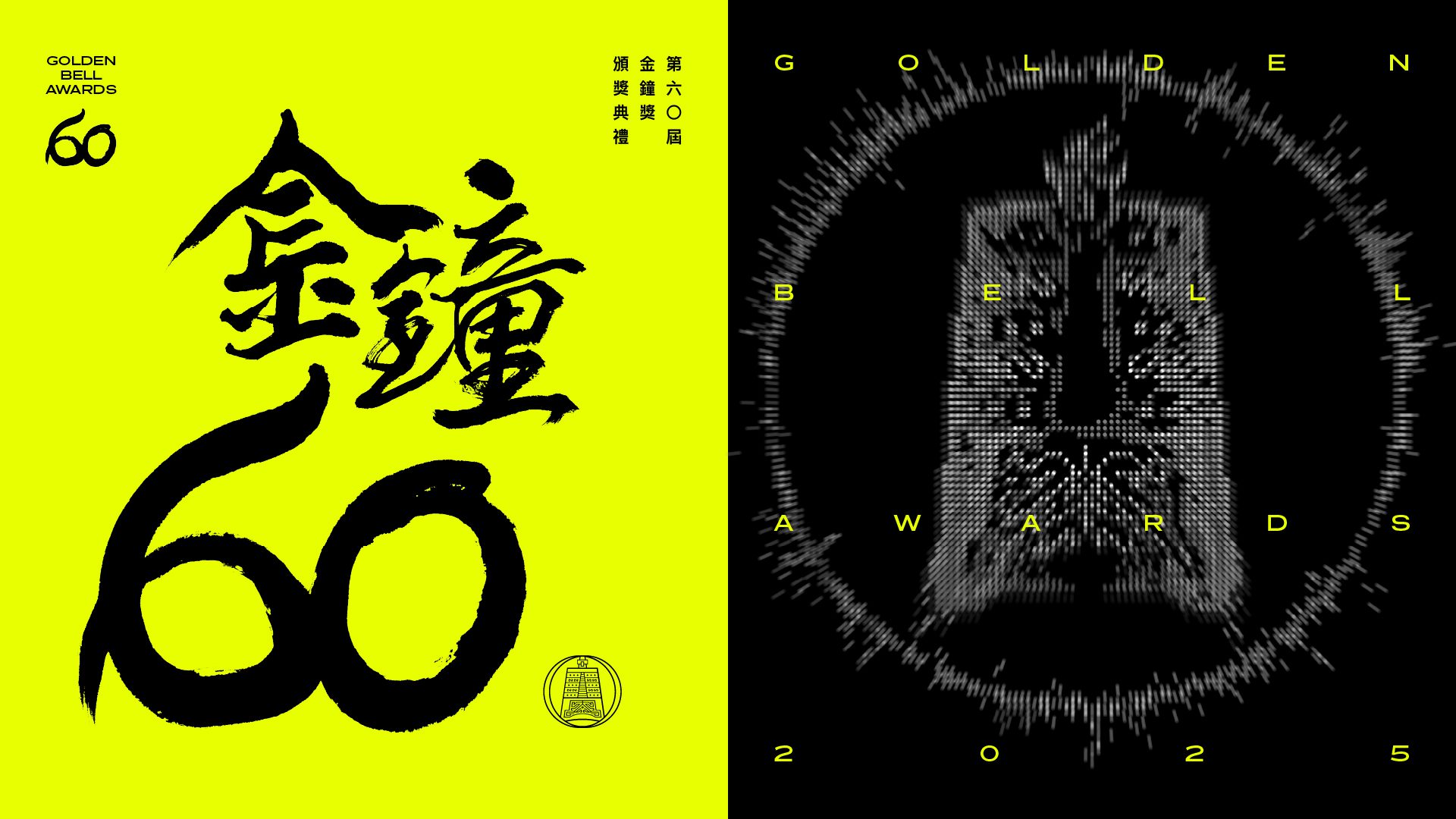 現年82歲的書法藝術家董陽孜於2024年登上紐約大都會博物館,成功將臺灣的書法美學推向國際視野,並獲《紐約時報》盛讚為「用筆墨寫自由」的藝術家。她長年致力於以傳統書法結合當代藝術,讓毛筆字跳脫框架、煥發新意。在金鐘60主視覺中,董陽孜老師以揮灑自如的筆觸書寫「金鐘60」,其中數字「6」更是別具巧思,在造型上具有蛇的意象,呼應今年為蛇年,再由臺灣當代設計團隊 Path & Landform 延伸創意,融合書法的文化底蘊與現代設計語彙,形塑出具穿透力的視覺語言。在色調上,主視覺選用螢光黃作為主色調,不僅呼應金鐘獎的傳統金色意象,更象徵未來的亮度與能量,展現無限可能。「金鐘60」主視覺螢光黃與董老師筆墨間的黑白對比,構築出跨越世代的視覺張力,一端是文化深厚的書寫痕跡,一端是數位時代的未來語彙,兩者相互輝映,不僅是傳統與創新的交會,也象徵臺灣影視文化持續向世界發聲的姿態。