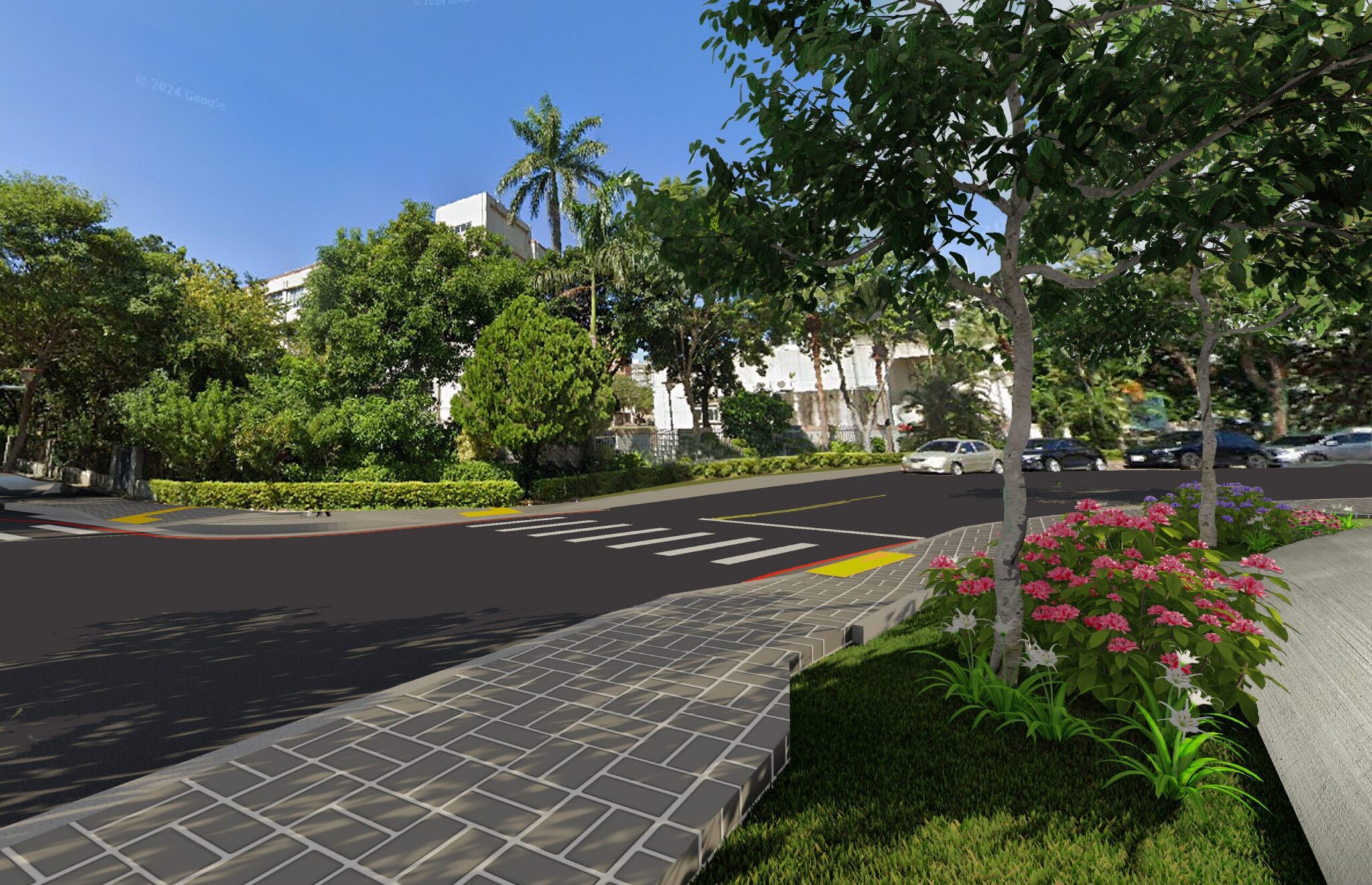 同時,工程保留沿線既有喬木資源,街角景觀採複層式植栽及通透鋪面設計,增設庇護空間與地被植物,提升整體街景綠意與視覺舒適度,兼顧美觀與環保。