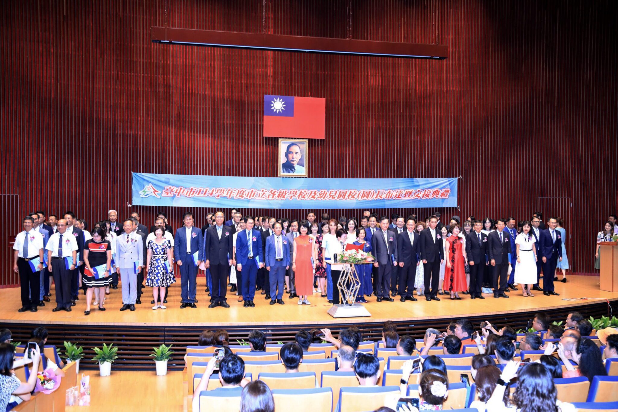 台中市114學年度市立各級學校及幼兒園校(園)長布達交接典禮今(1)日在市政大樓4樓集會堂隆重舉行。新學年度獲遴聘校(園)長共101位,包括連任校(園)長34人、調任校長36人及初任校(園)長31人;市長盧秀燕除向退休校長表達最真摯的謝意,並期許連任、調任及初任校長用心聆聽,帶領教師們共同努力,培養更多優秀的人才。