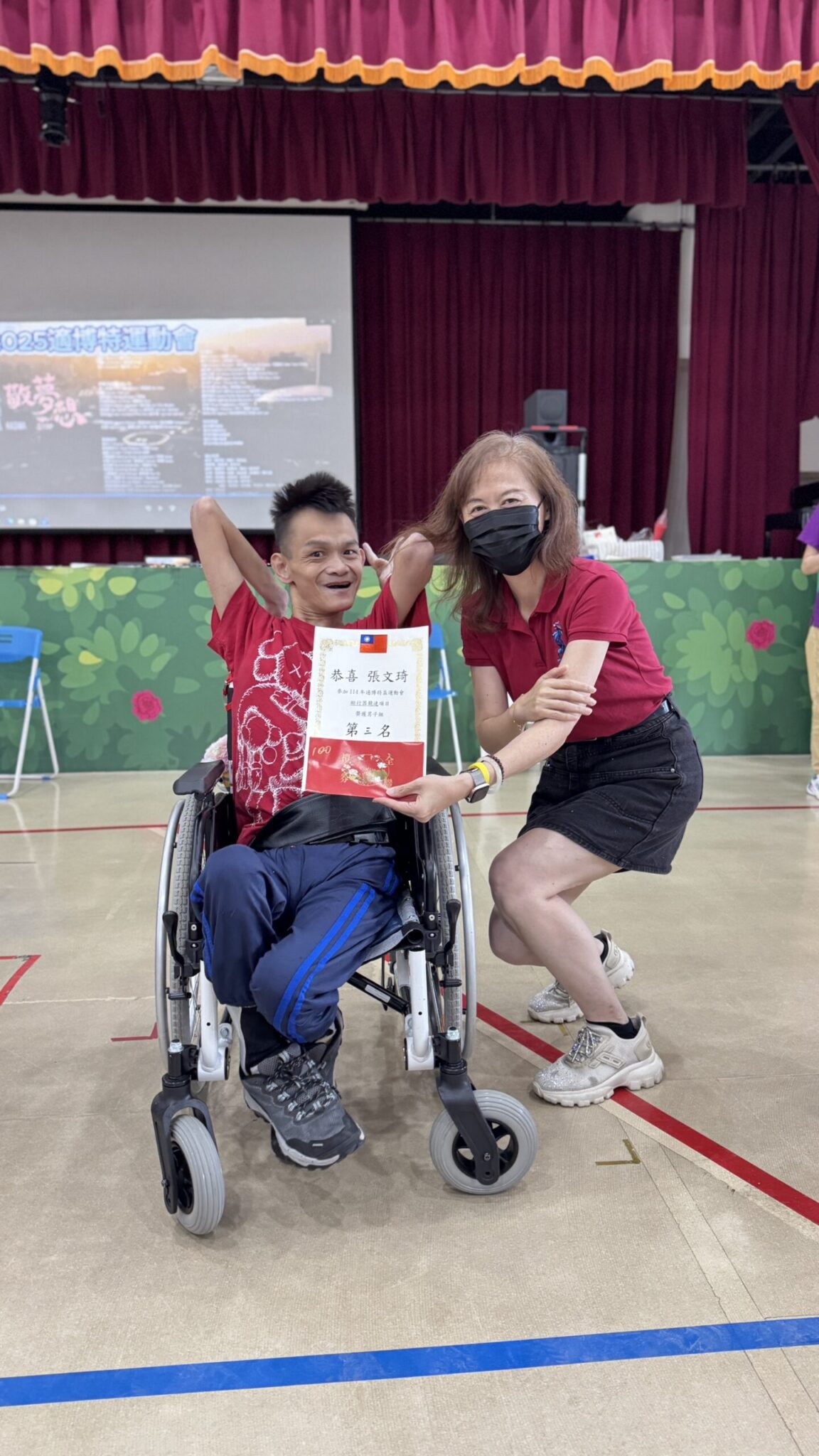 另一位感動全場的是高照護專區的院生小文。小文同樣罹患重度腦麻,長年與腸扭轉及身體退化奮戰,手部功能受限的他,靠雙腳操控助行器與輪椅,成為復健室裡最勤奮的身影。運動會中,他在助行器與輪椅競速兩項比賽中脫穎而出,闖進前三名,更被大家暱稱為「飛毛腿」。當他奮力衝過終點,全場皆為他的毅力與精神動容。