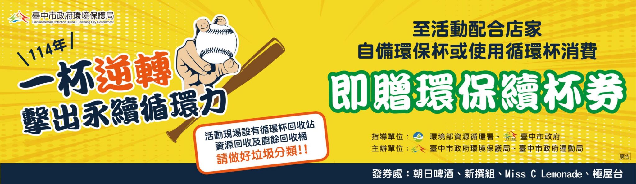 中華職棒2025年下半季賽事如火如荼對戰中,減塑行動也在球場內熱烈推動。台中市政府環保局今年攜手台中洲際棒球場合作推動「一杯逆轉擊出永續循環力」循環杯活動,活動期間為8月8日、8月9日、8月10日、8月13日及8月14日共五場賽事登場,場內4家合作店家(朝日啤酒、新撰組、Miss C Lemonade及極屋台)全面使用循環杯,取代一次性飲料杯;活動期間球迷朋友只要自備環保杯或使用循環杯至合作店家消費盛裝飲品,即可獲得環保續杯券(限量換完為止),誠摯邀請球迷朋友響應「自備、重複、少用」綠消費環保心。