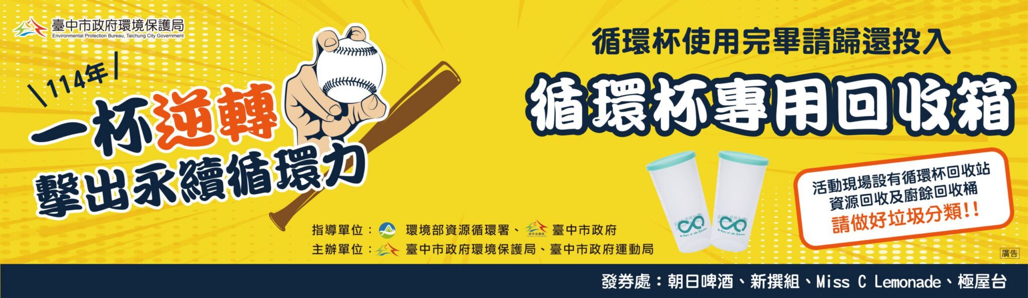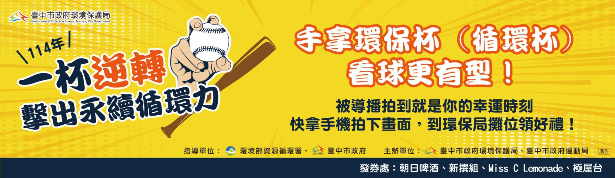 環保局誠摯邀請球迷朋友,一起前進台中洲際棒球場,用行動愛地球,一起一杯逆轉擊出永續循環力,更多活動訊息請關注「台中好環保」粉絲專頁( https://www.facebook.com/recycle.tcepb )查詢。