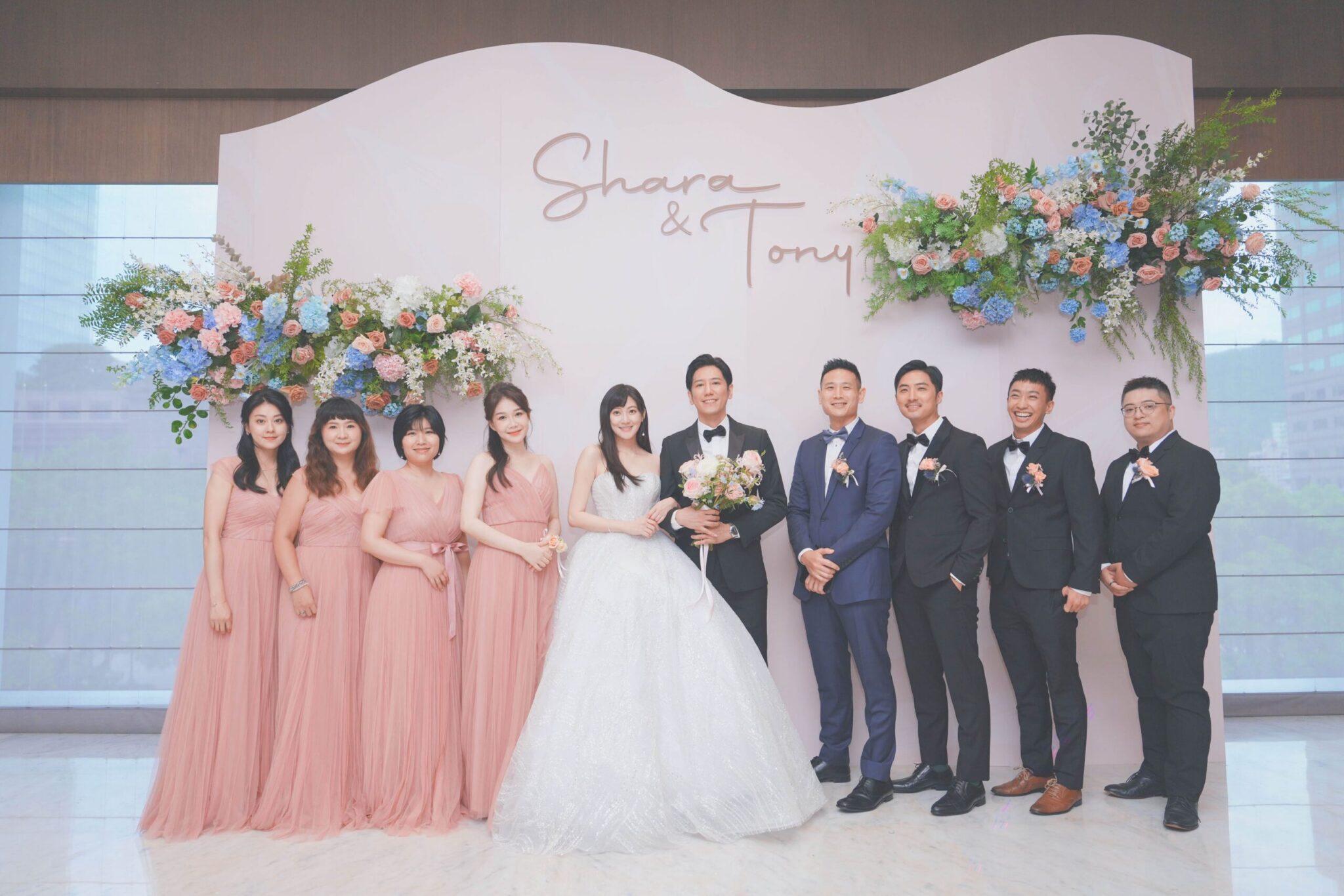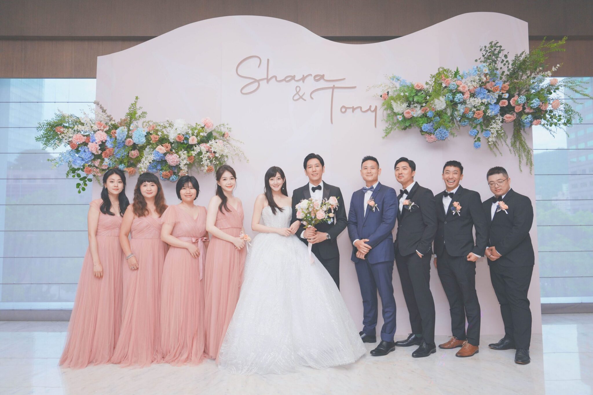 「Shara❤Tony囍宴」歷經三年疫情延宕、由八位伴娘與伴郎陪伴下終於在親友滿滿祝福中順利完成。    照片提供:欣宇宙音樂